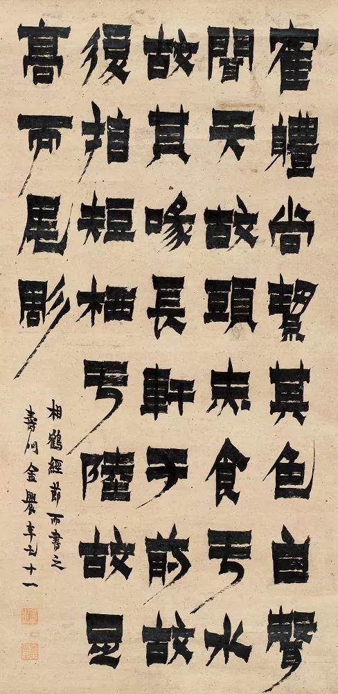 看到上面的字型对书法不太了解的朋友一定会较为陌生,它便是清代书画名家金农所创字型,将汉隶与魏碑二者风格融为一体,墨色乌黑光亮宛如漆成。被世人称为——漆书