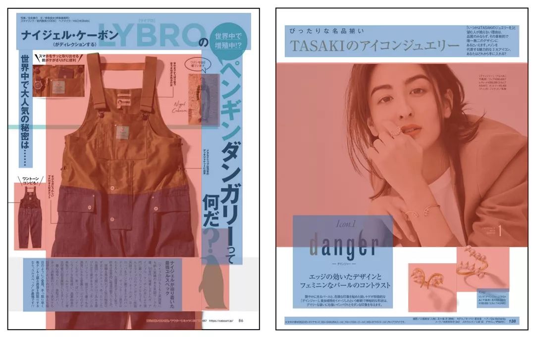 在课程开始之前,我们先来看一些杂志的图片。这三张是以一张大图片为主体的杂志页面,我们将图片用红色的色块标记,文字则用蓝色的色块标记。我们可以发现,红色部分的面积远大于蓝色部分的面积。