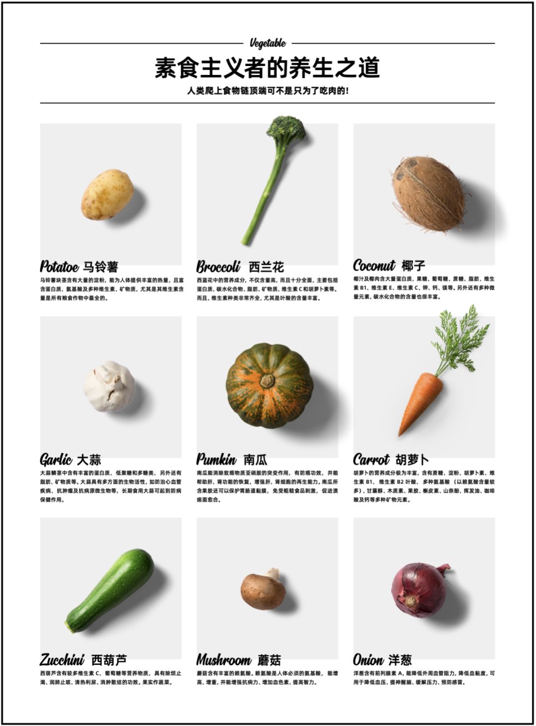 我们用个案例来展示一下吧,例如这样一个版面,整齐地排列着九种不同的蔬菜,可是由于这些蔬菜的形状各异,导致了负空间特别的零碎,画面显得有些散。