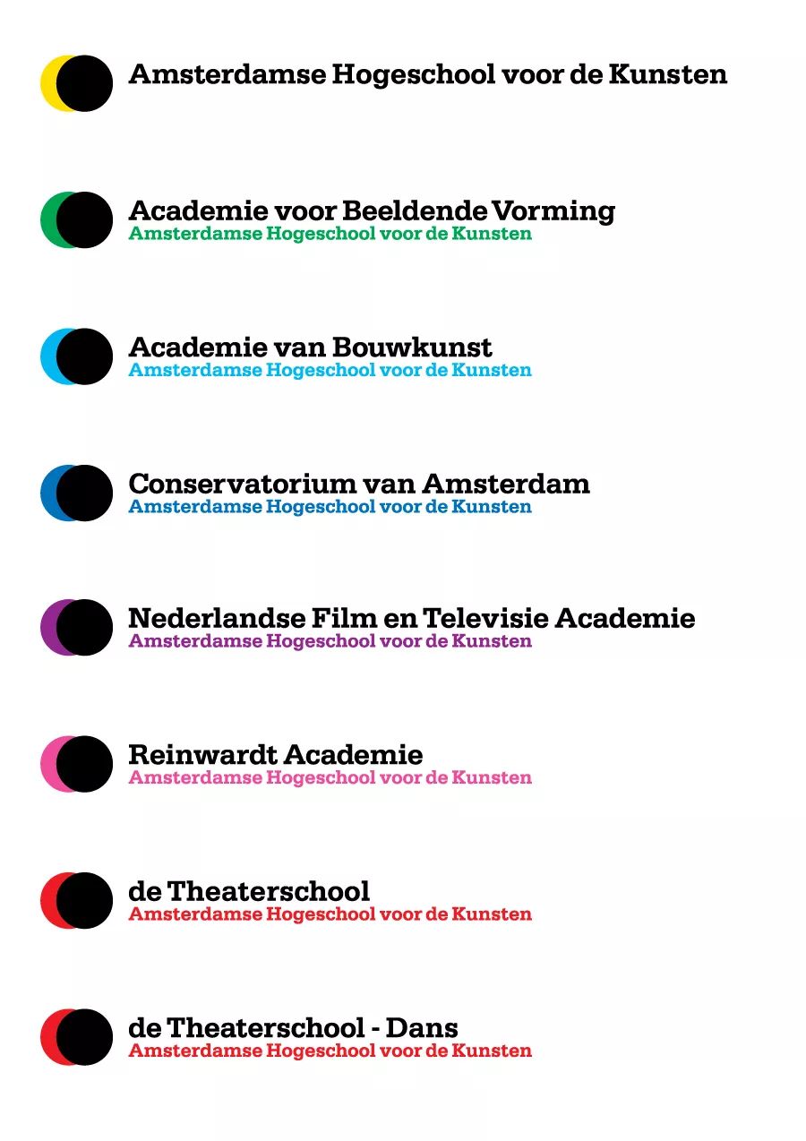 新的身份使阿姆斯特丹艺术大学及其六个学院具有可见性和可识别性。一个符号,两个完美的圆向右偏移,位于底部。每个教职员工都通过自己的颜色清楚地识别。其特点是,教职员工的名称保持黑色,而主要机构的名称适应其颜色。