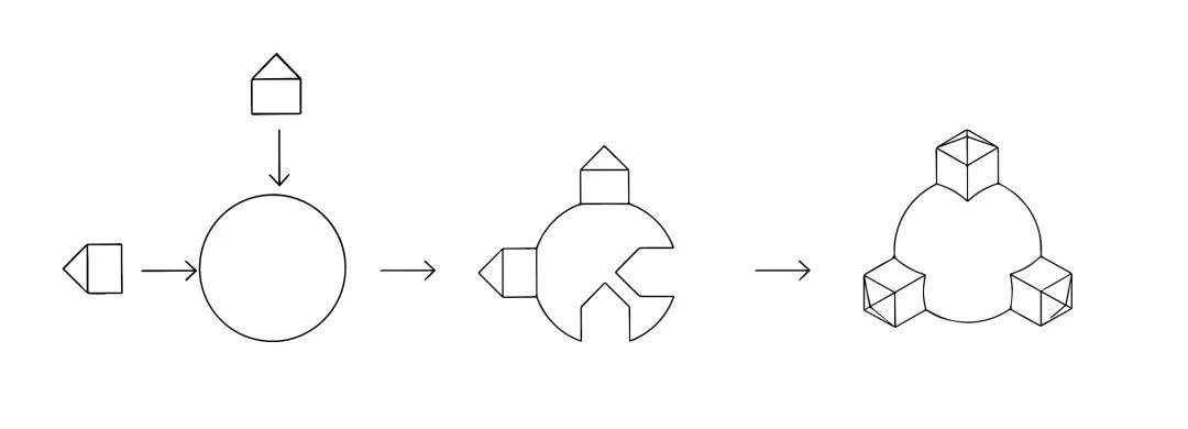 thonik从一个代表地球的圆开始,之后增加了一个“小房子”,重复这个图形最终形成一个图案。
