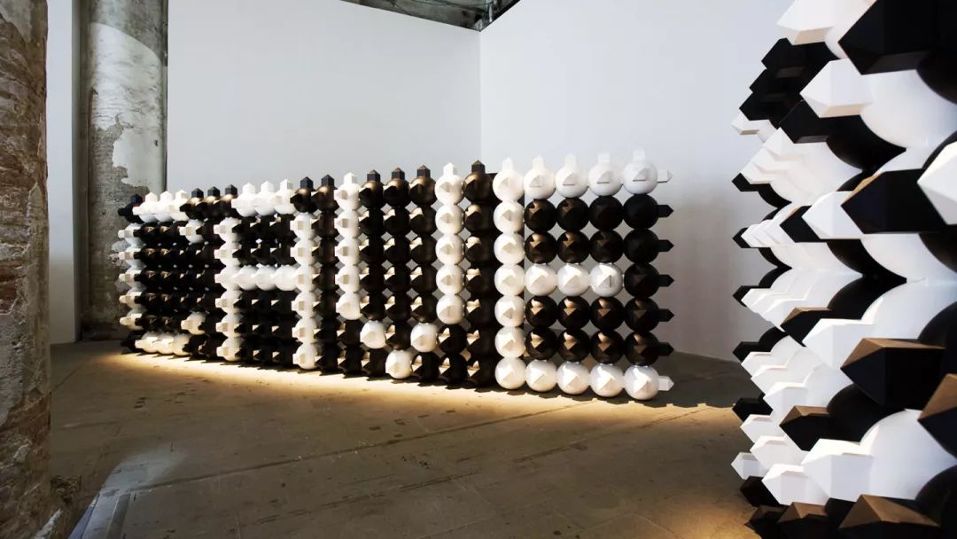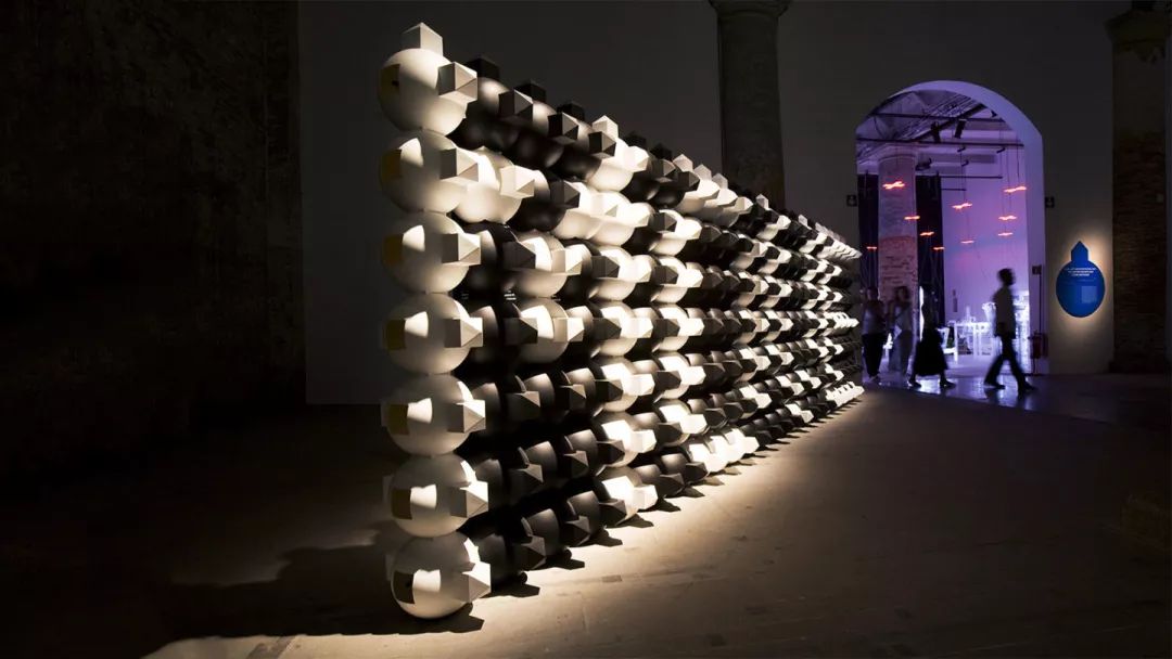 文字设计在图案上会改变颜色。场景设计中,我们把二维的视觉识別三维化。8个球高的“球墙”分隔了展览空间。黑球和白球的组合形成清晰的文字,引导参观者观展。