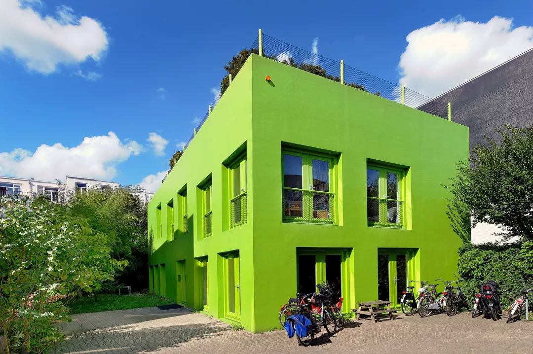 后来因为周围邻居的抗议,可能是觉得颜色太鲜艳了吧。thonik将工作室重新刷成了苹果绿。