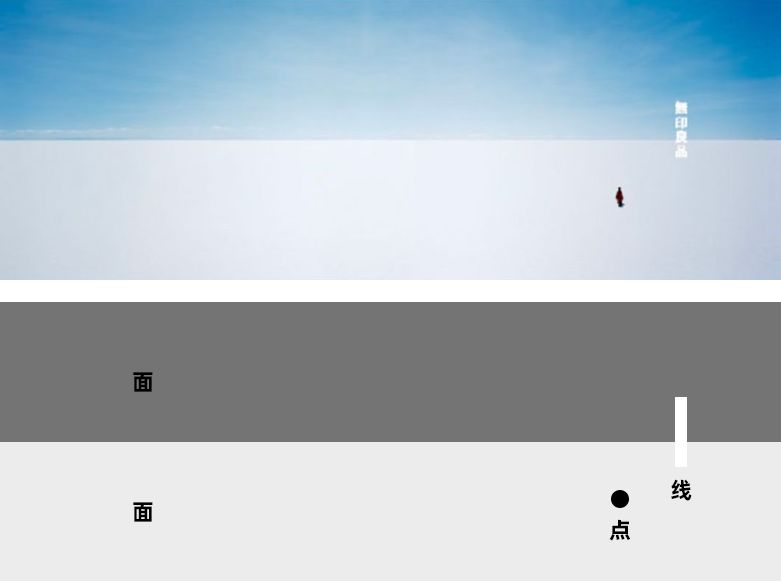 说到点线面的综合应用,就不得不提原研哉大师的经典作品,无印良品的地平线系列海报,简直教课书一般的点线面应用。