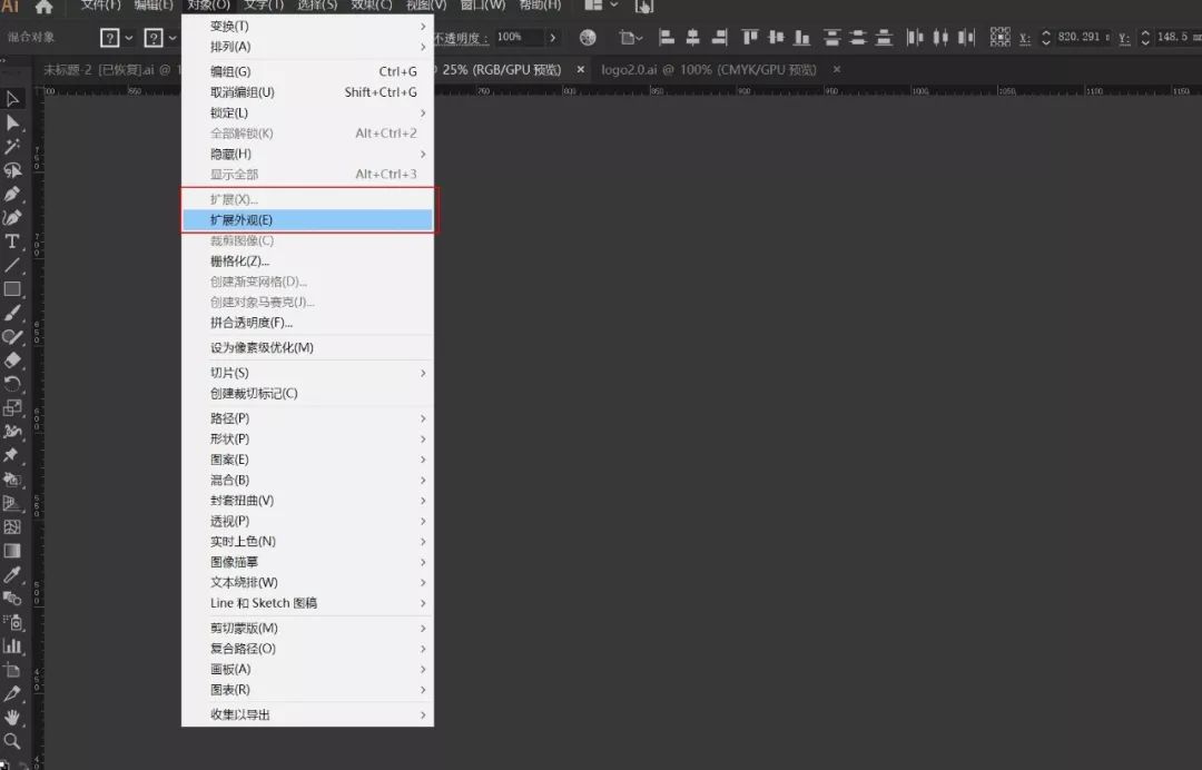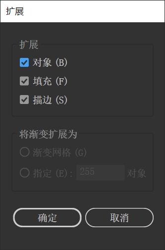 点击扩展外观会让程序吧整个设计稿取消群组,并且打散成独立的板块,再点击扩展就可以转曲了,如果扩展外观为灰色,则只需要点击扩展。