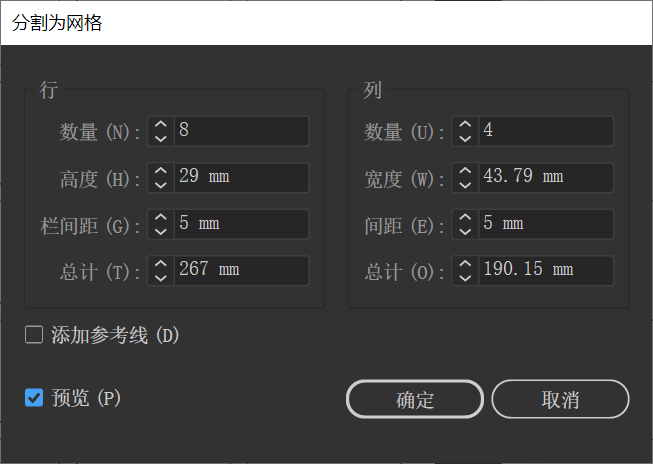 弹窗中我们主要设置网格的行列和栏间距即可,比如一个32格网格我们便可以按照上面的参数设置