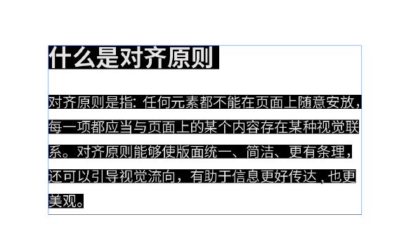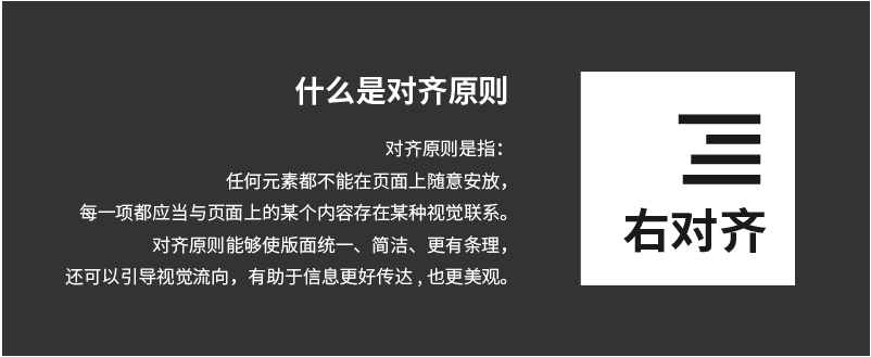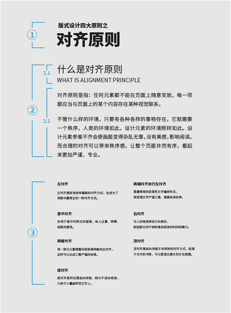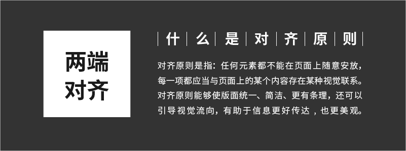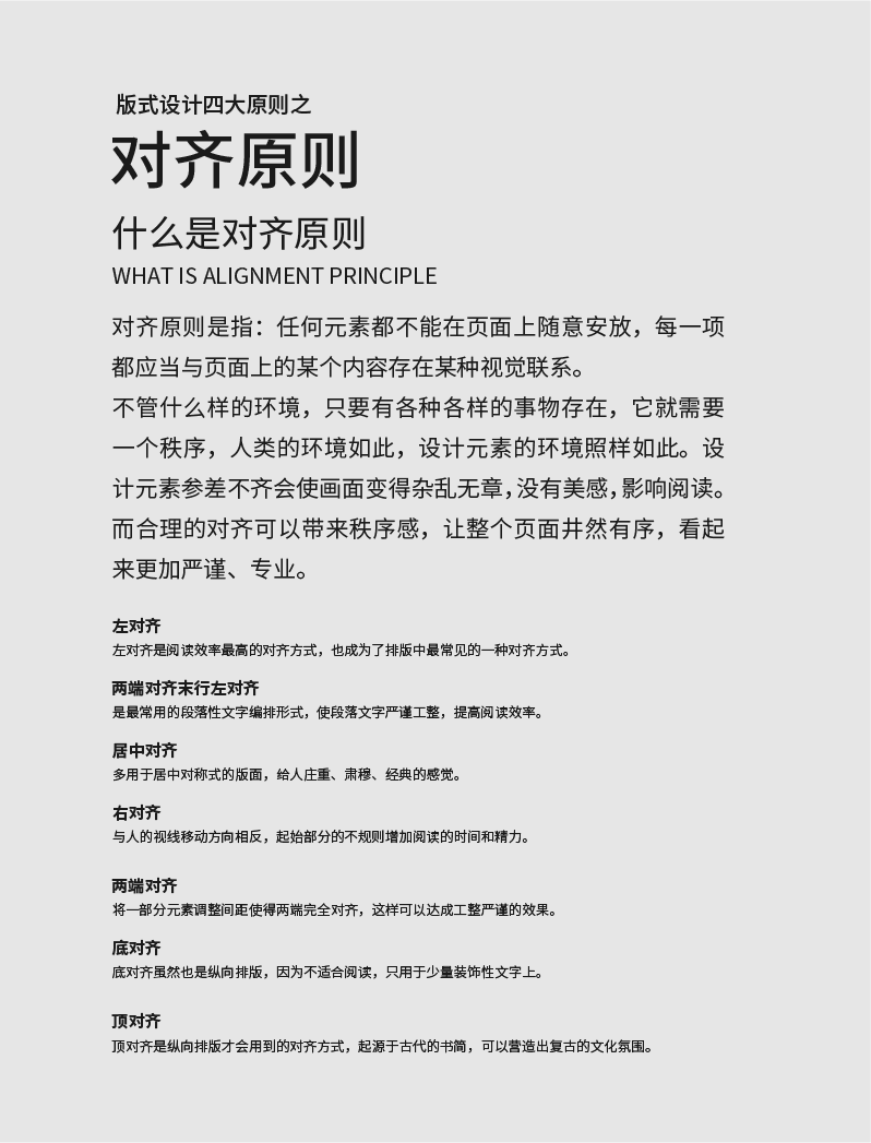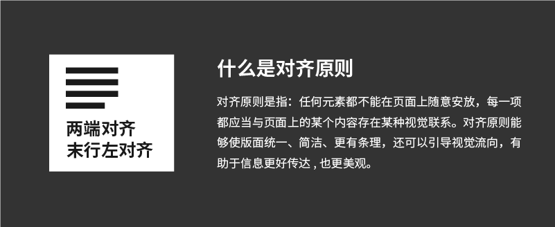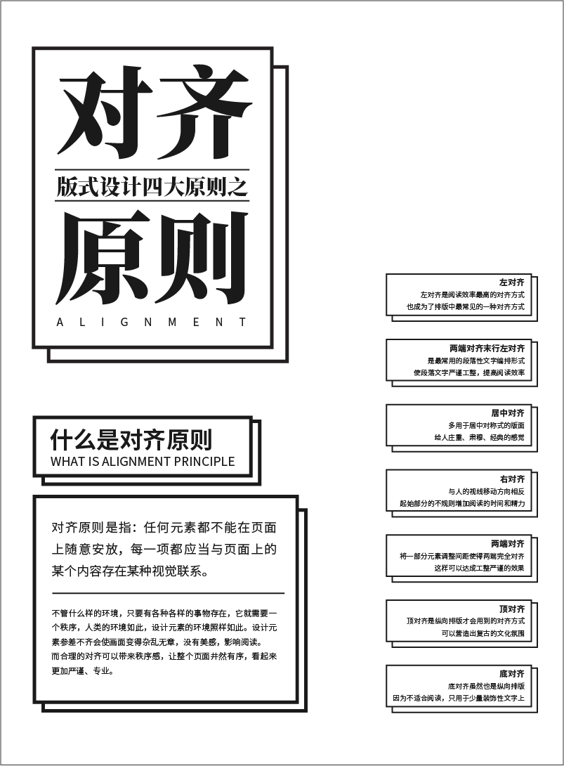 “对齐原则简介”文字采用左对齐格式,可以保持文字本身的起伏和韵律,还能保证较好的阅读体验。另外文字较多的一段,可以采取两端对齐末行左对齐格式。使段落文字严谨工整,让版面清晰有序而有条理,提高阅读效率。