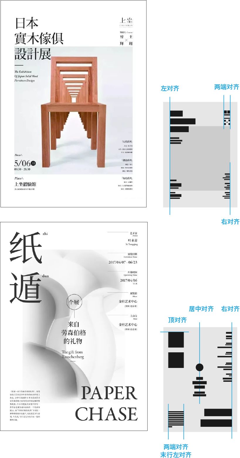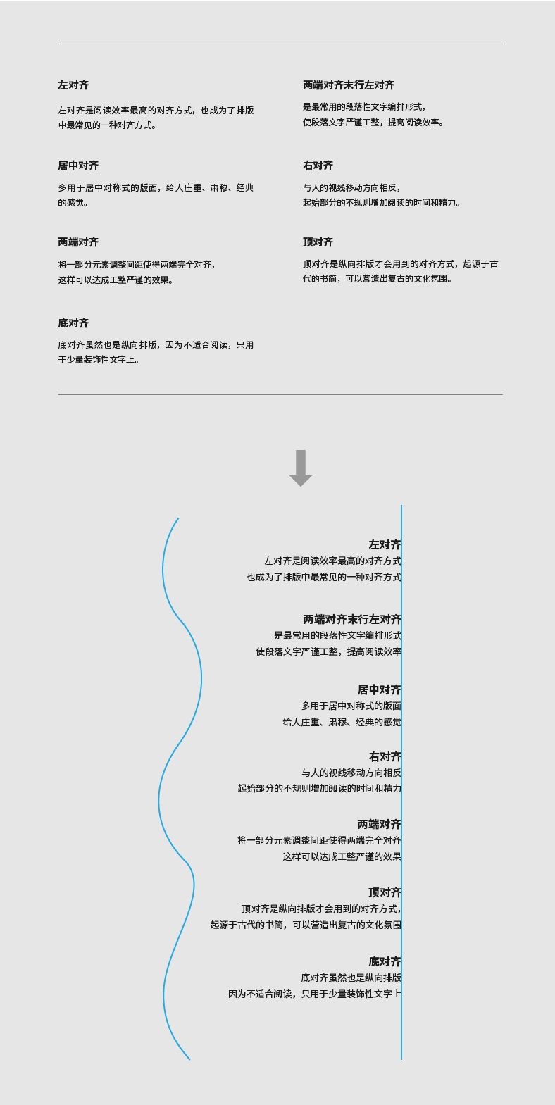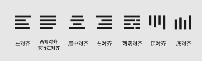 文字编排常用的对齐方式有:左对齐、两端对齐末行左对齐、右对齐、居中对齐、两端对齐、顶对齐和底对齐等。在进行设计时要根据构图形式选择合理的对齐方式,每种对齐形式所传达的视觉感受也不一样。(对齐名称只是为了便于讲解和记忆,不一定与软件中的名称一致)