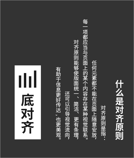 底对齐也使用在纵向排版,每一行起始部分的不规则增加消耗了阅读的时间和精力,是最不适合阅读的对齐方式,一般只用于少量文字或作为装饰性元素使用。