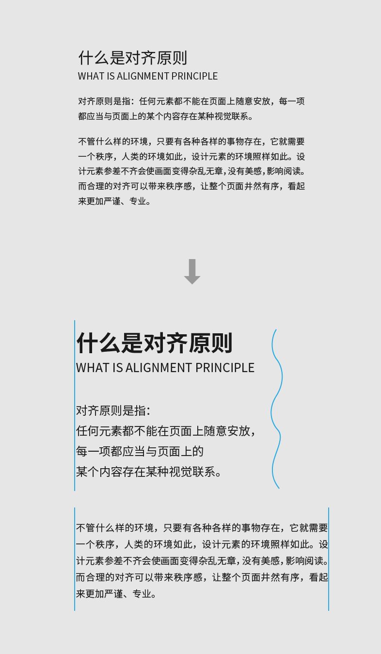 不管什么样的环境,只要有各种各样的事物存在,它就需要一个秩序,人类的环境如此,设计元素的环境照样如此。左下图设计元素参差不齐,画面显得杂乱无章,没有美感,影响阅读;而右下图运用合理的对齐可以带来秩序感,看起来更加严谨、专业,信息传达效果更好。