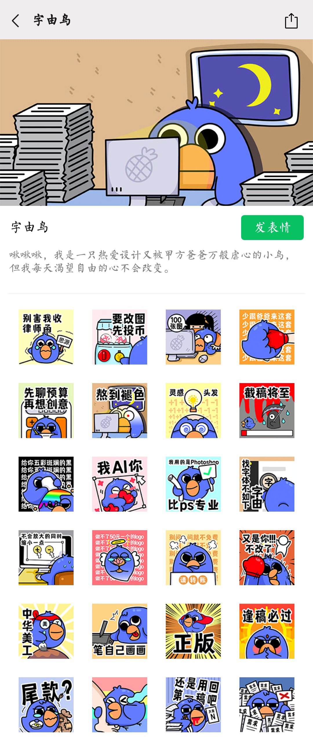 但作为设计师的好盆友,小蓝鸟不能光靠颜值,还要有逆天的才华与智慧。所以今天,我带来了万众期待的专属表情包!(不用存图、文末有链接)