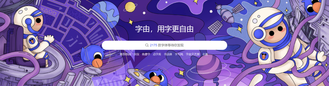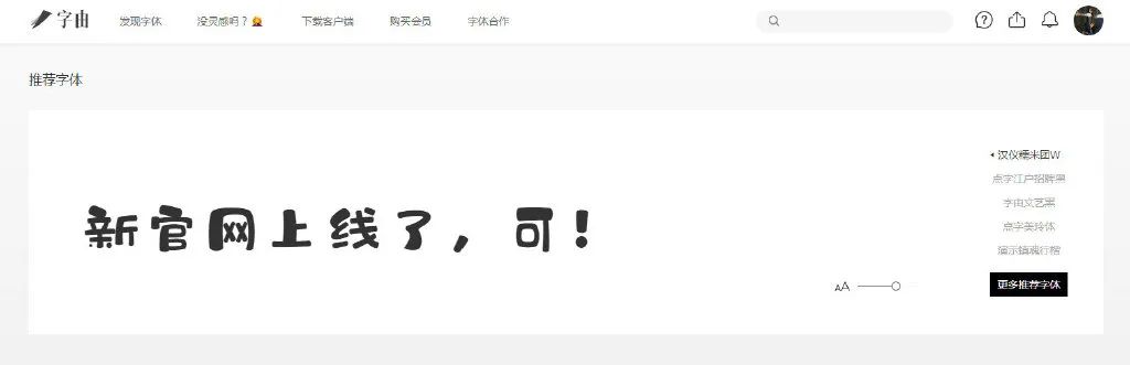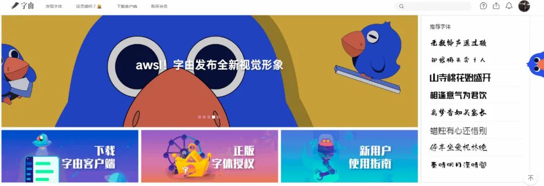 除了颜值,它还有哪些可探索的地方,今天柚子就来说一说。以前打开官网,第一眼就是大大的轮播图,而现在强化了搜索栏,再配以绝美的插画,时时刻刻提醒你,来搜我啊,来找字啊!如果不知道从何入手,也可以点击下方的推荐热词,从字体的品牌、风格、类型都有。很方便吧,至于之前的轮播图,则改成了小的四栏展示,每周更换,只po你最想看的~总有人找不到哪里下载客户端,所以这次有了更多提示,首先是页面右边的小鸟。这次改版还有一个柚子很满意的地方,就是首页的推荐字体,之前没什么存在感,现在放大了,还可以撩你,比如上线那天是这样。