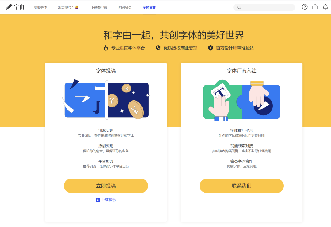 随着字由的影响力越来越大,合作越来越多,我们也顺势开辟了一个新的项目,那就是字体合作。如果你爱好字体设计,想把你的创意落成字库,可以选择字体投稿。如果你是字体厂商,已经有现成的字库,也可以像华康字型、文悦字库那样入驻字由,多一个曝光渠道,且字由不收取任何费用。无论哪种形式,字由都抱着开放、探索、共赢的态度,力求和所有志同道合的人,一起开创字体的美好世界。最后悄悄说下,手机端也可以联系我们哦(点击公众号菜单栏——字由星球——字体合作)~