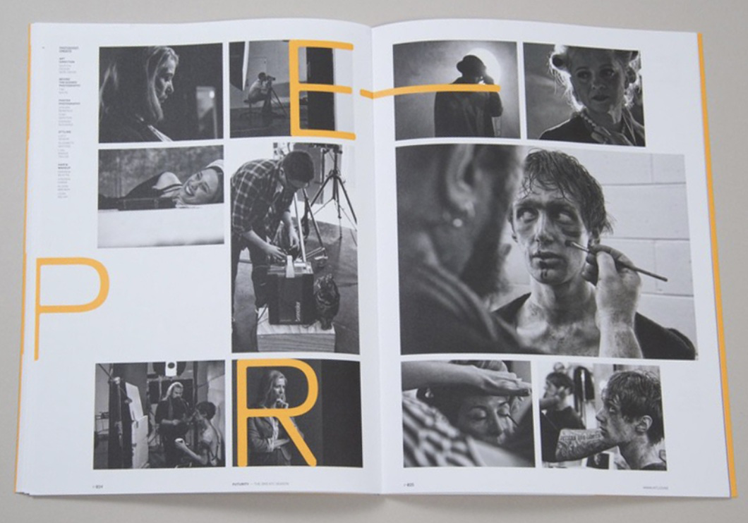 汇总重新观察一下,上面几张画册的重点部分是什么,那就是会有叠压的感觉。这里只是一个细节,而脱离网格型的版式,往往就是大量的图片和文字的相互叠压,组合在一起。