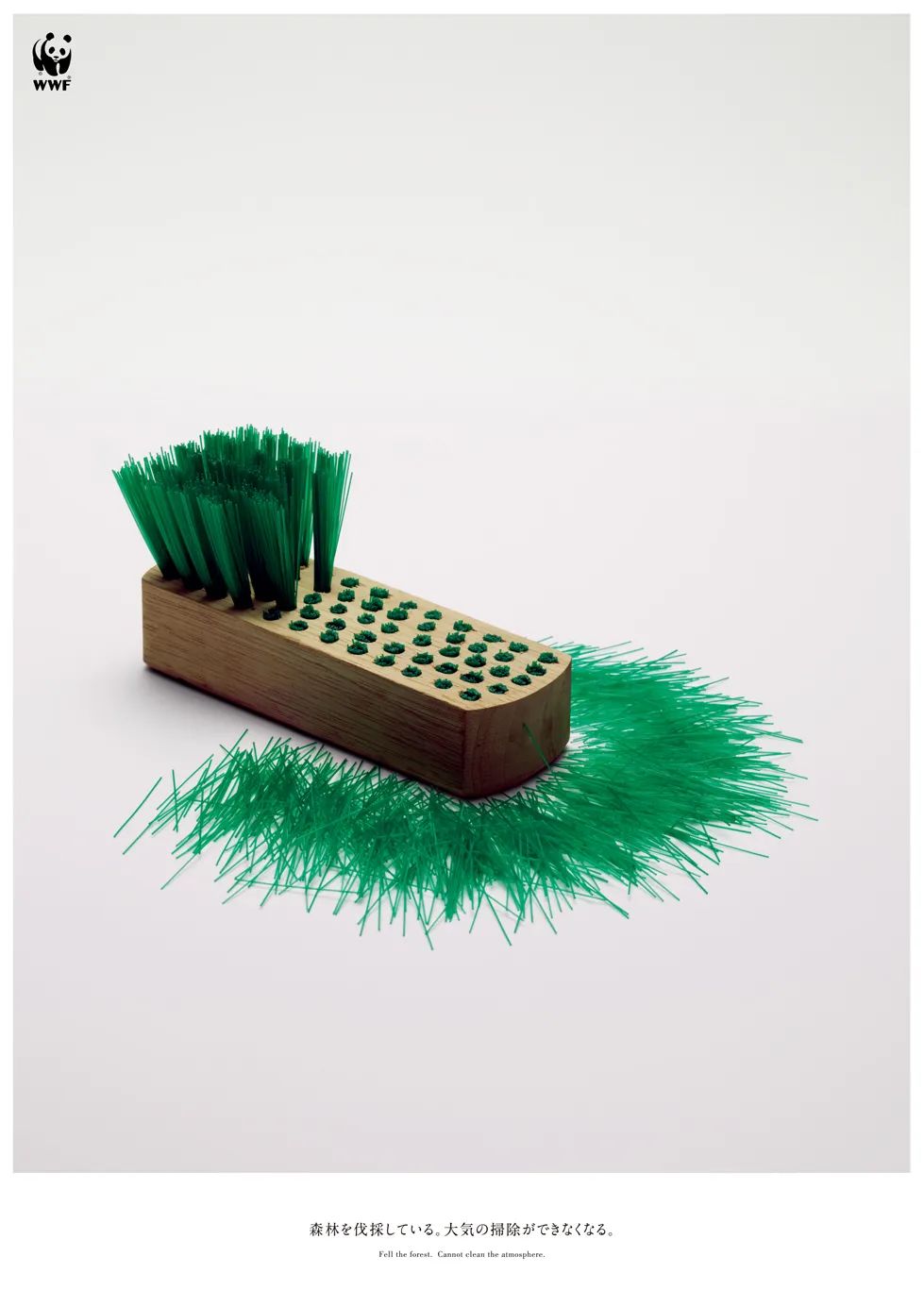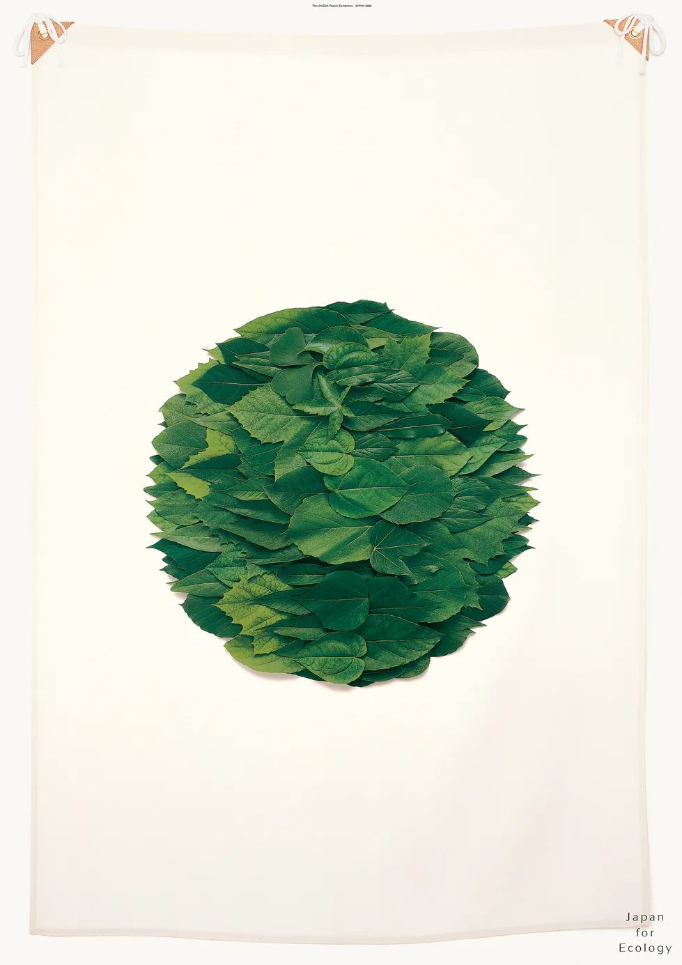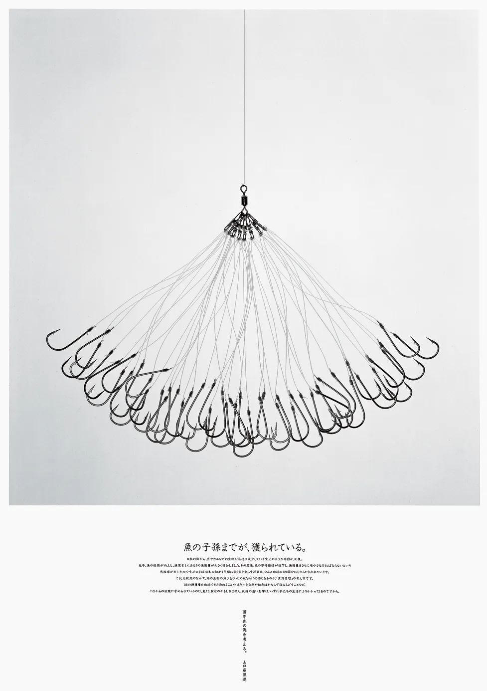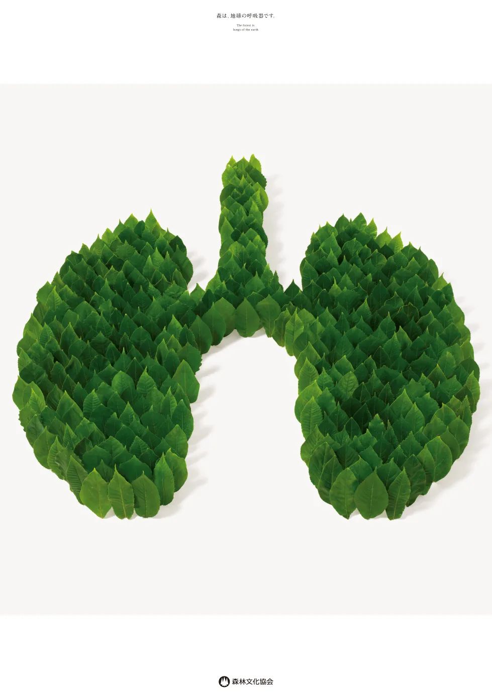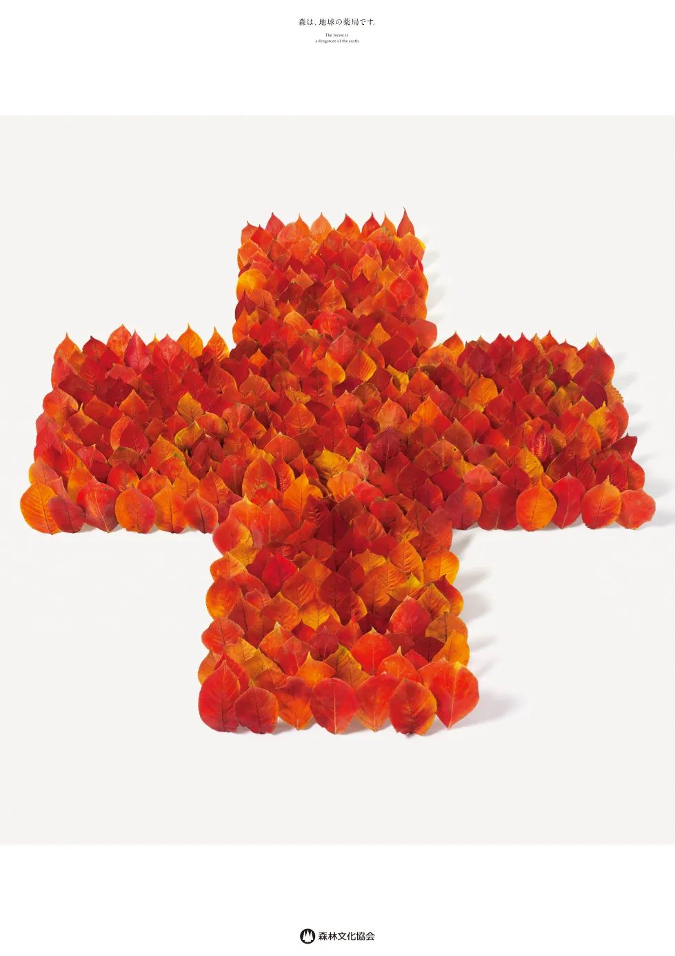 上面的海报是这一系列中最知名的一张。有一次新村则人从电视节目中了解到,森林采伐是海鱼减少的一个重要原因,于是他专门收集了一些树叶,把叶子放在一个空旷的背景上,末端伸出一个鱼的尾巴,乍看去两者便形成了一尾鱼的形状,形象地表现出森林与鱼类唇亡齿寒的关系。