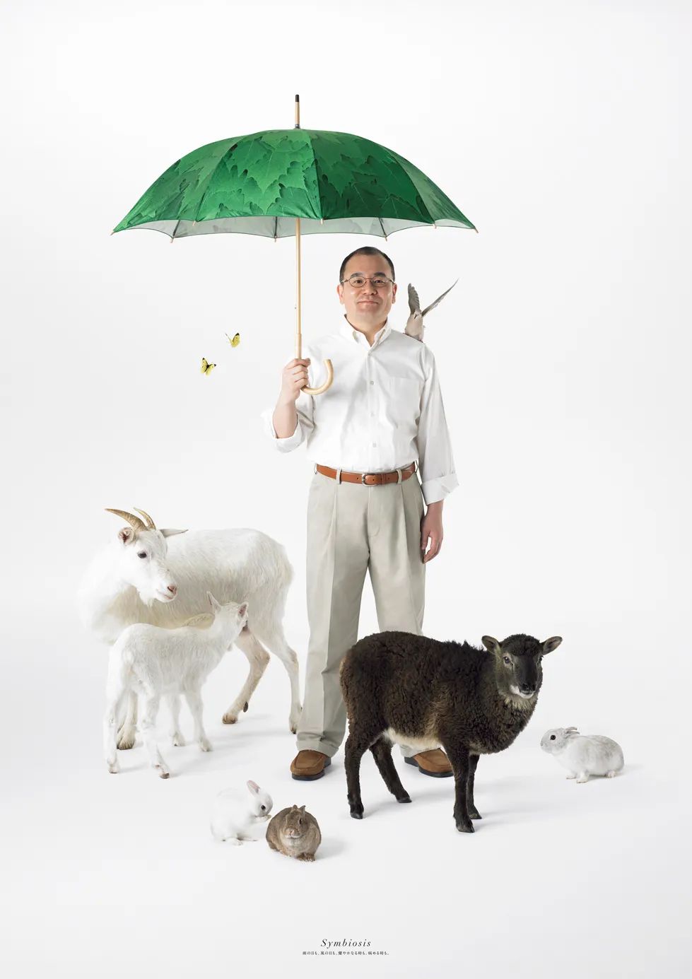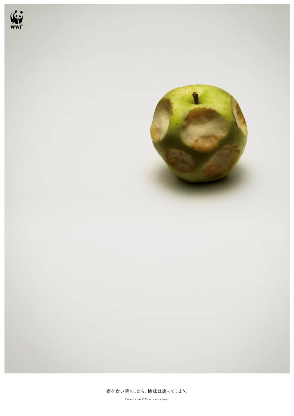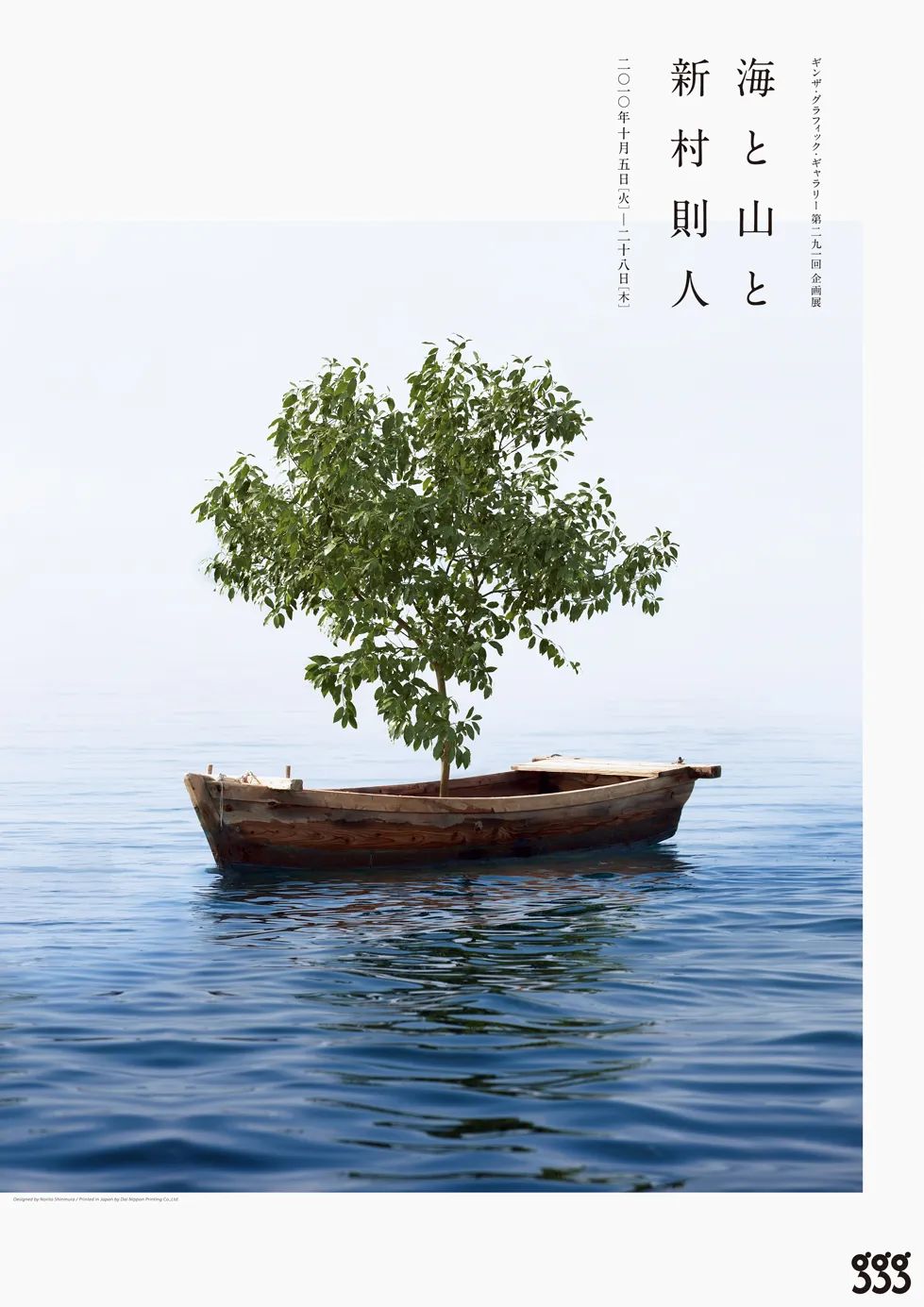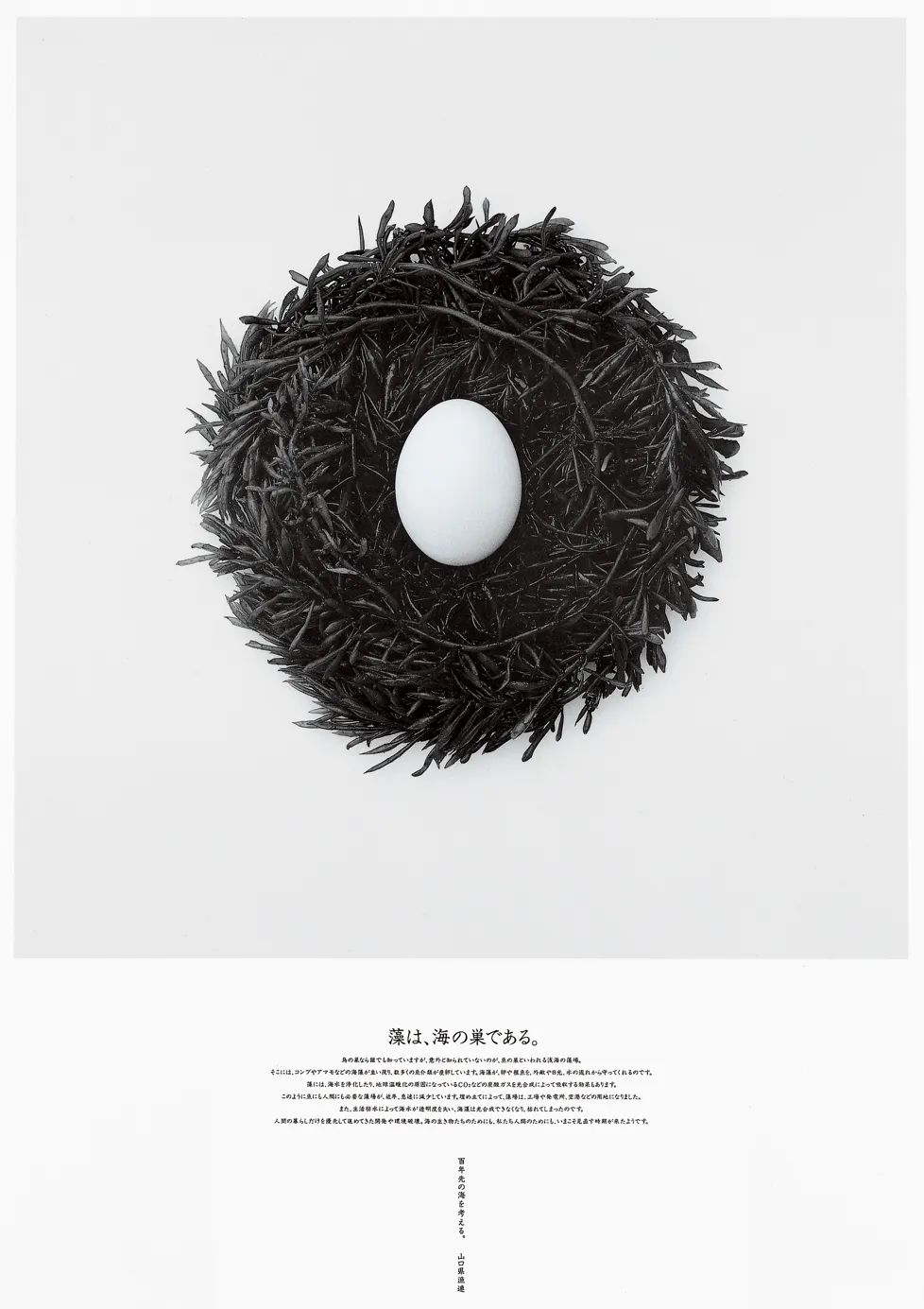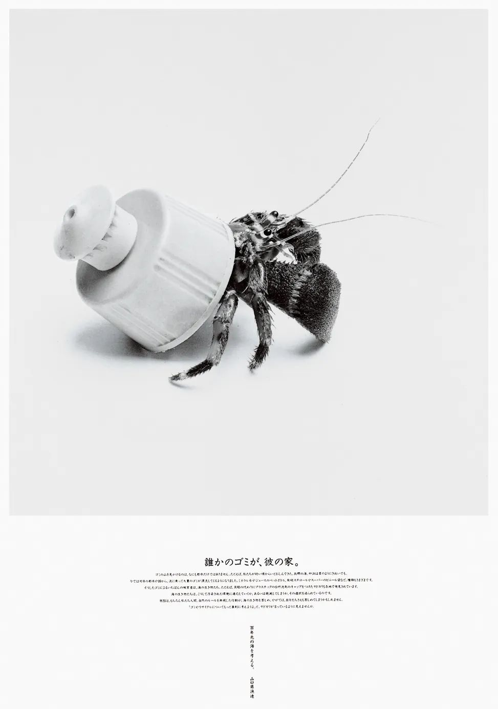 上面的海报是这一系列中最知名的一张。有一次新村则人从电视节目中了解到,森林采伐是海鱼减少的一个重要原因,于是他专门收集了一些树叶,把叶子放在一个空旷的背景上,末端伸出一个鱼的尾巴,乍看去两者便形成了一尾鱼的形状,形象地表现出森林与鱼类唇亡齿寒的关系。