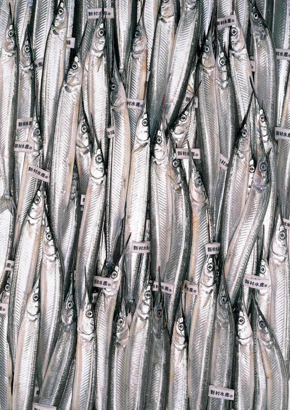 这鱼飞得这么飘逸也是实拍么?这一组的主题是“岛上的渔夫”,这些渔夫都是新村则人的亲戚。一开始我还以为他们是把鱼扬到天上,后来一想那画面太美,确实是不敢看。其实这些鱼是在游,镜头是透过一个清澈的鱼缸在拍摄,仔细看后面海面的畸变,就能发现其中的端倪。为了呈现最新鲜健康的鱼,他们带着鱼缸跟随渔船出海打鱼,在船上完成了实景拍摄。构图的话,应该是由鱼们自己把握的。