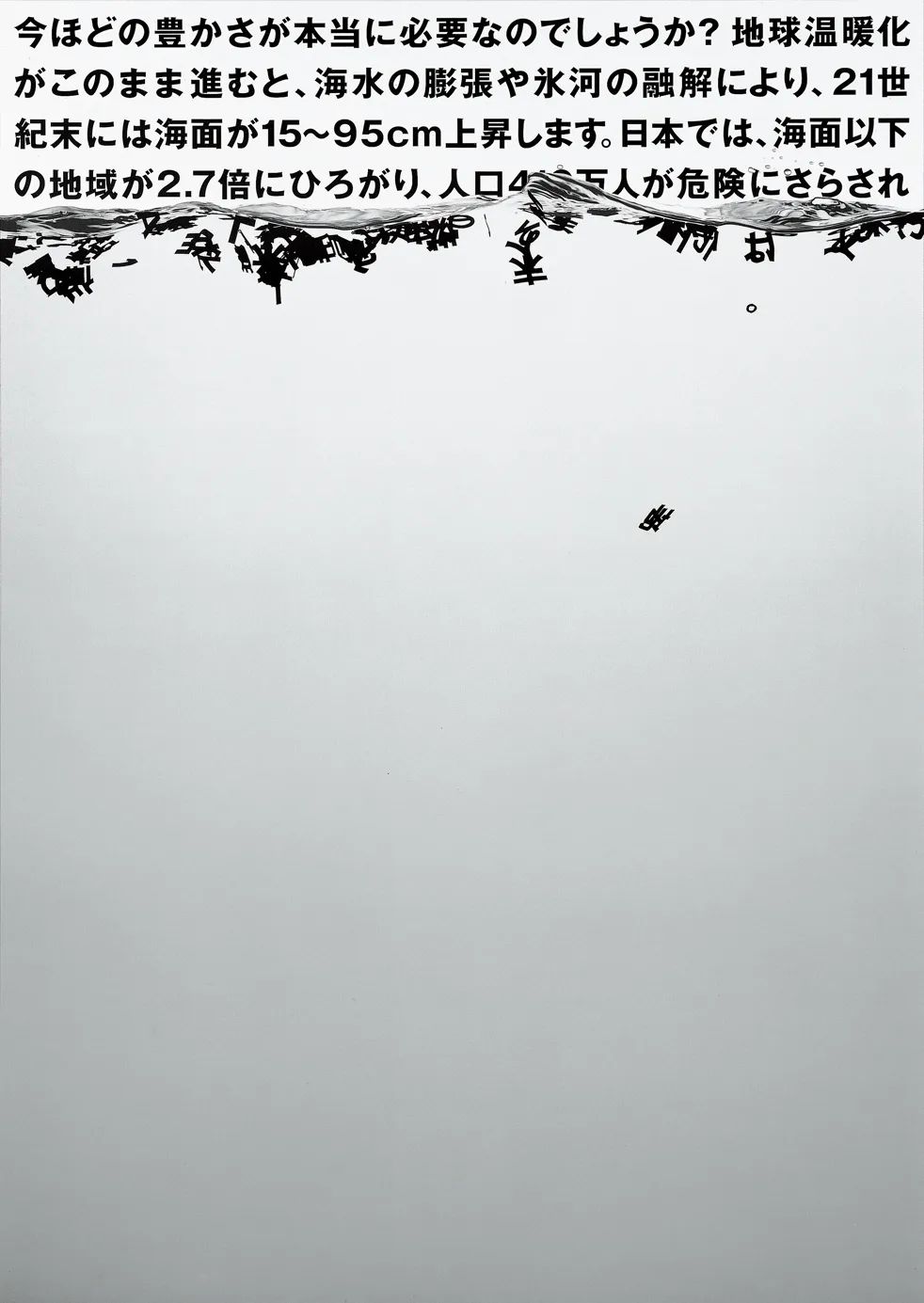 这幅作品除了顶级的创意之外,也几乎是新村则人手作海报的巅峰。不用不相信自己的眼睛,这张海报是手工制作的。新村则人在工作室里特制了一个玻璃水缸,然后将文字部分一个一个剪下来放入水中等待其沉没,并伺机拍摄,就是这么硬核。