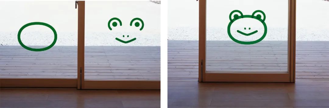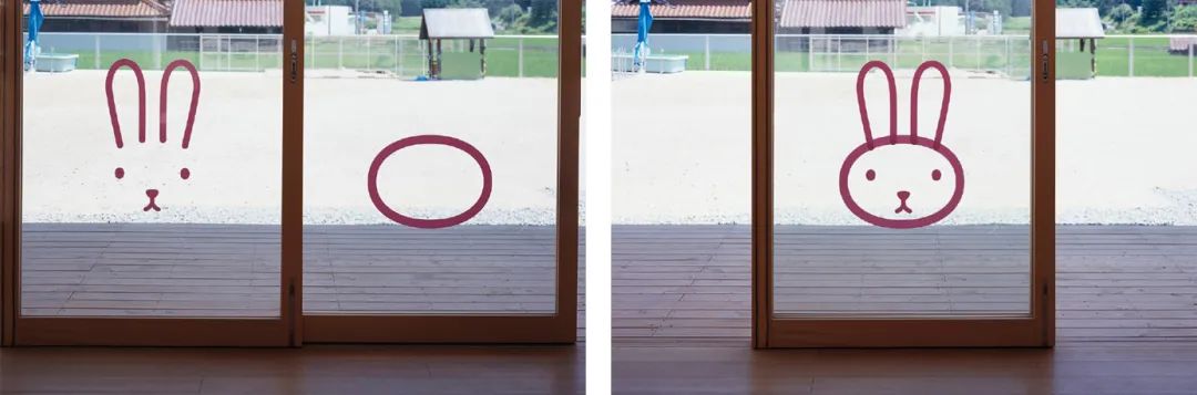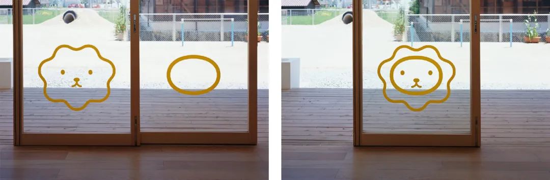 简单来说,椭圆更“尖”而它更“顿”。我觉得这会使它看起来更柔软,却又更坚固。窪田勝文在委托新村的时候还提出了另一个要求,希望孩子不要撞到门上的玻璃。于是,新村将标志延展成了一个防撞的设计。