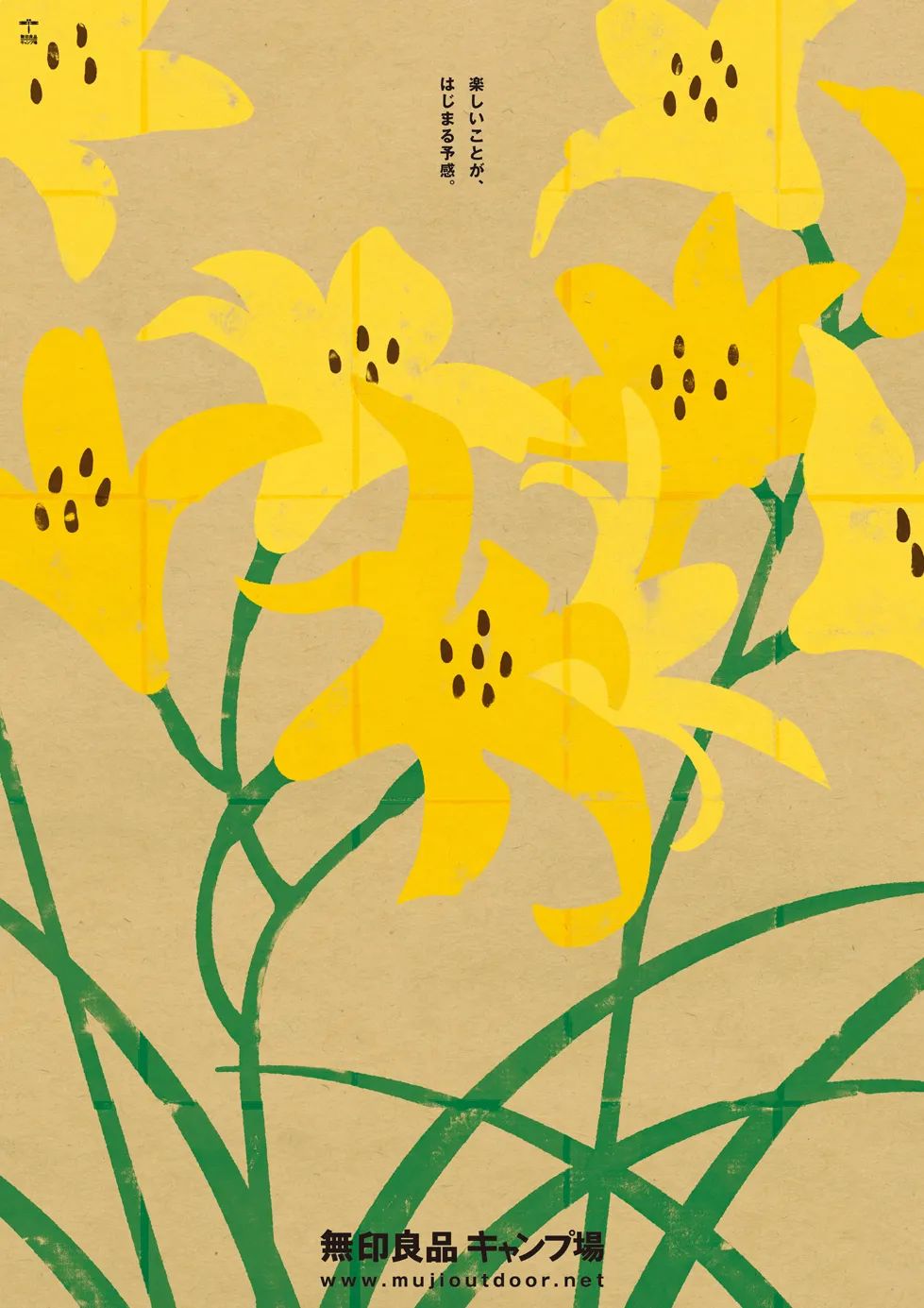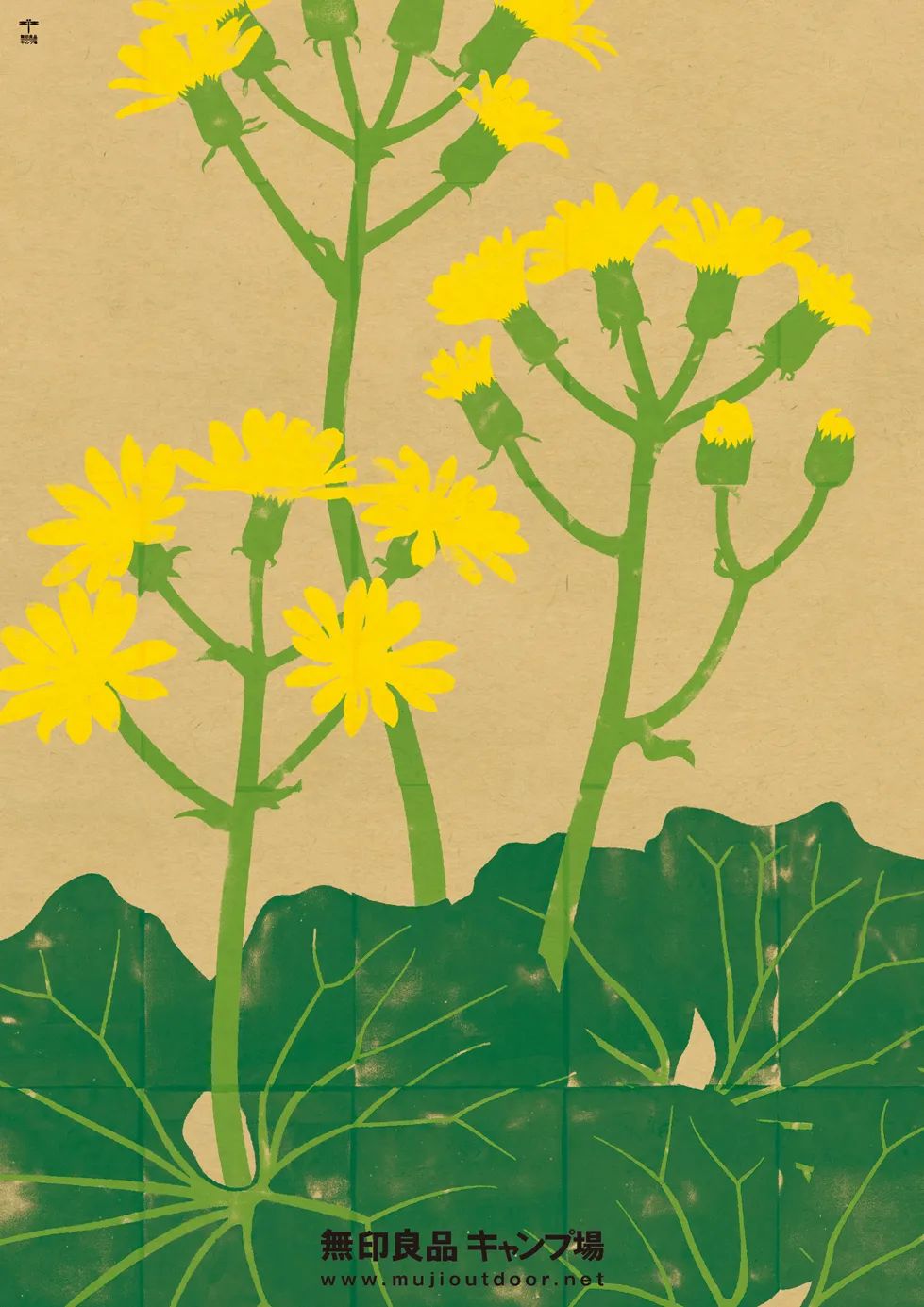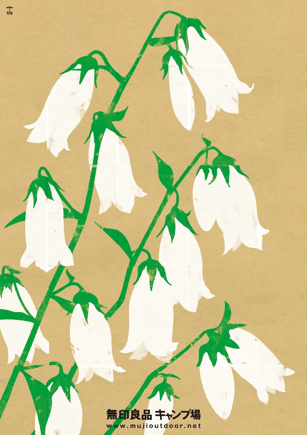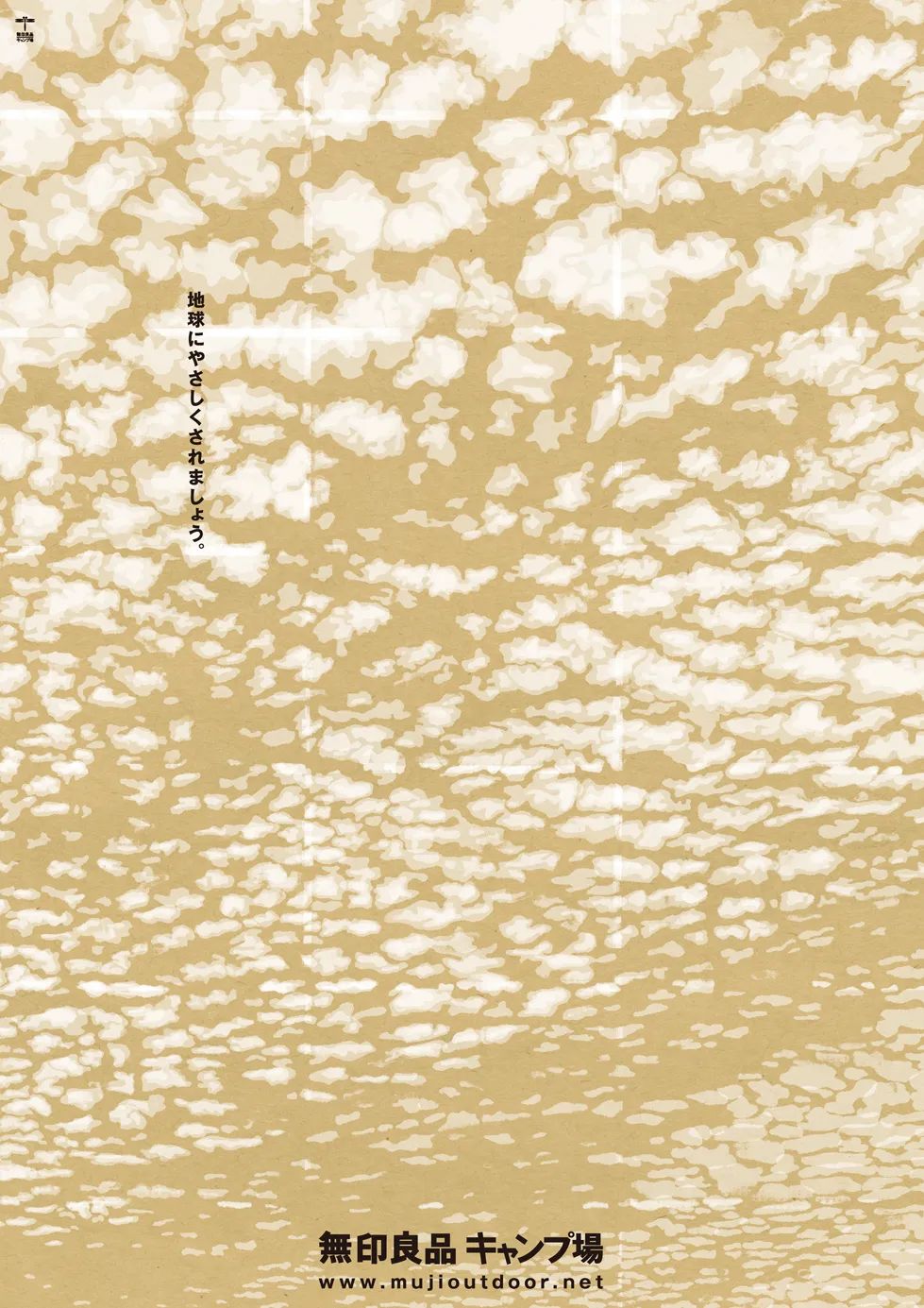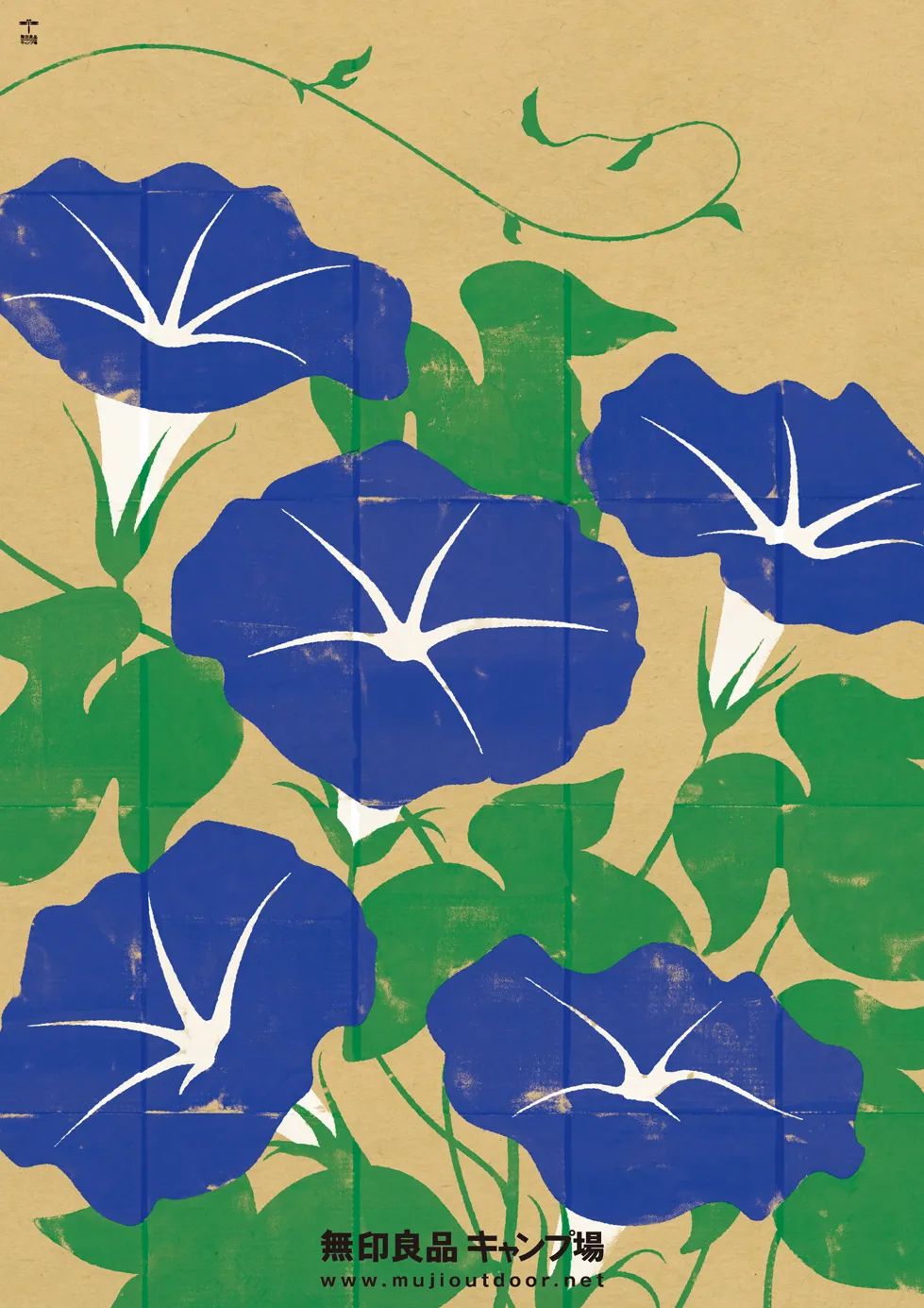 这组海报(2010)展示的是露营地的植物、昆虫和云。仔细观察你会发现图案的印刷上会呈现出一种自然的斑驳,同时还有明显的拼接痕迹。我知道PS的斑驳笔刷也能实现类似的效果,但新村肯定不会这么做。他采用了一种日本人用来印制传统贺卡的“丝网印”小机器。