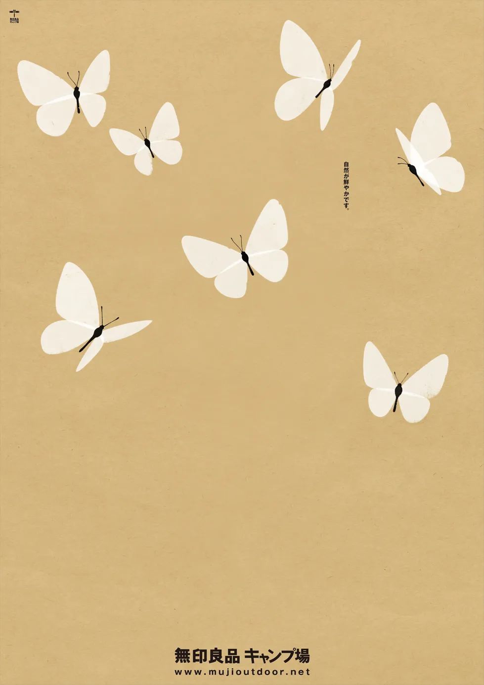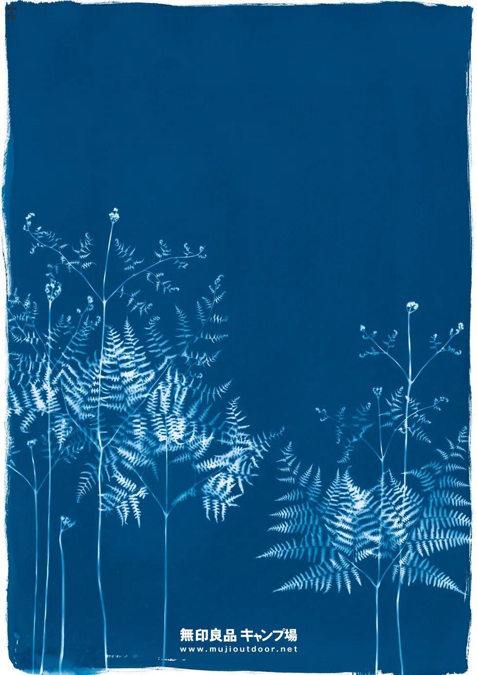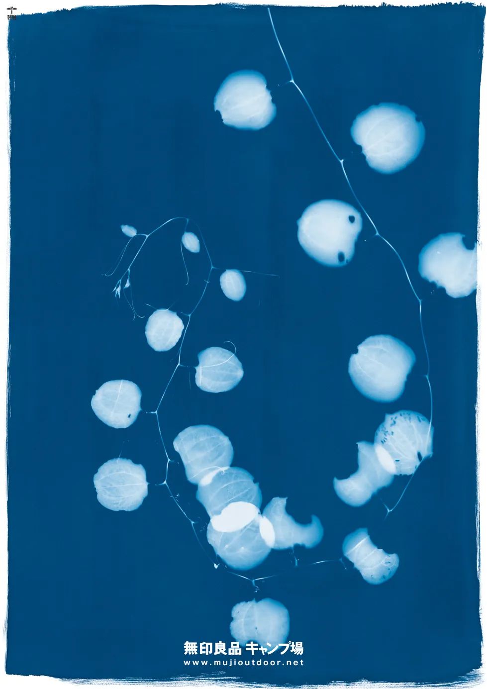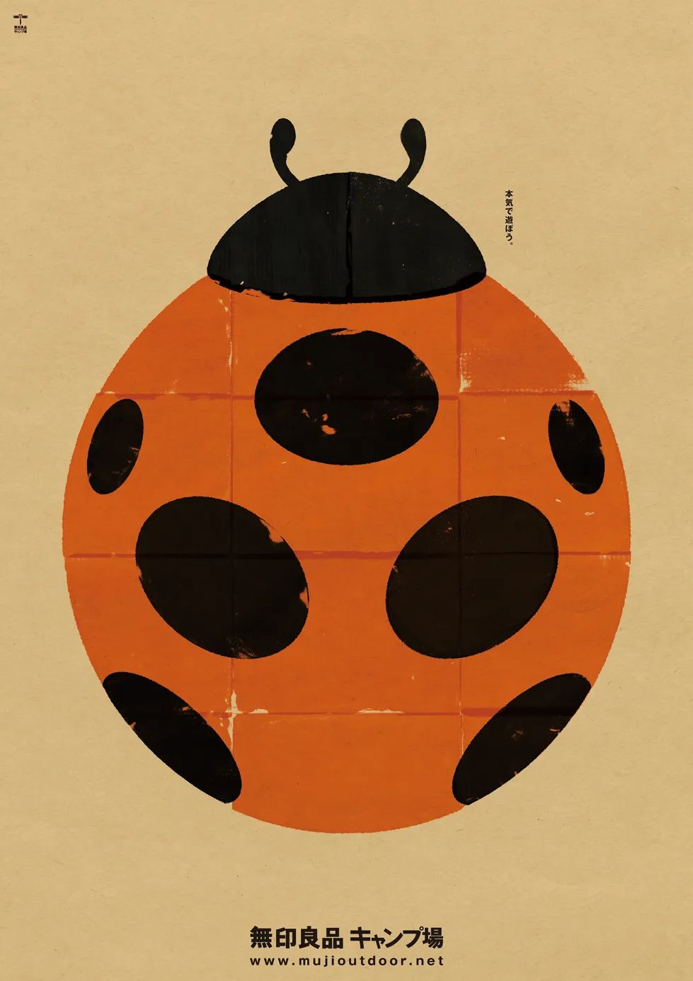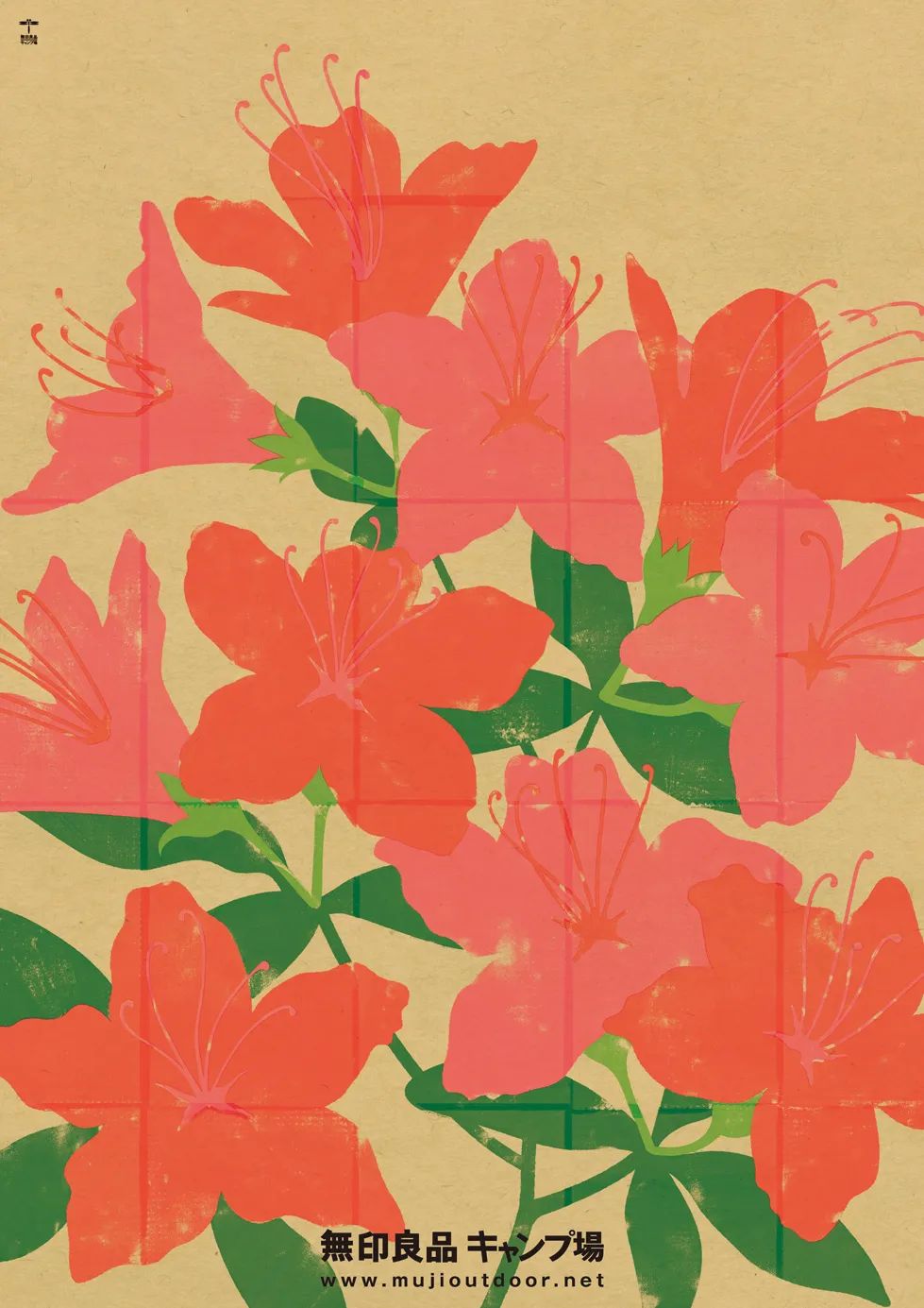 这组海报(2010)展示的是露营地的植物、昆虫和云。仔细观察你会发现图案的印刷上会呈现出一种自然的斑驳,同时还有明显的拼接痕迹。我知道PS的斑驳笔刷也能实现类似的效果,但新村肯定不会这么做。他采用了一种日本人用来印制传统贺卡的“丝网印”小机器。
