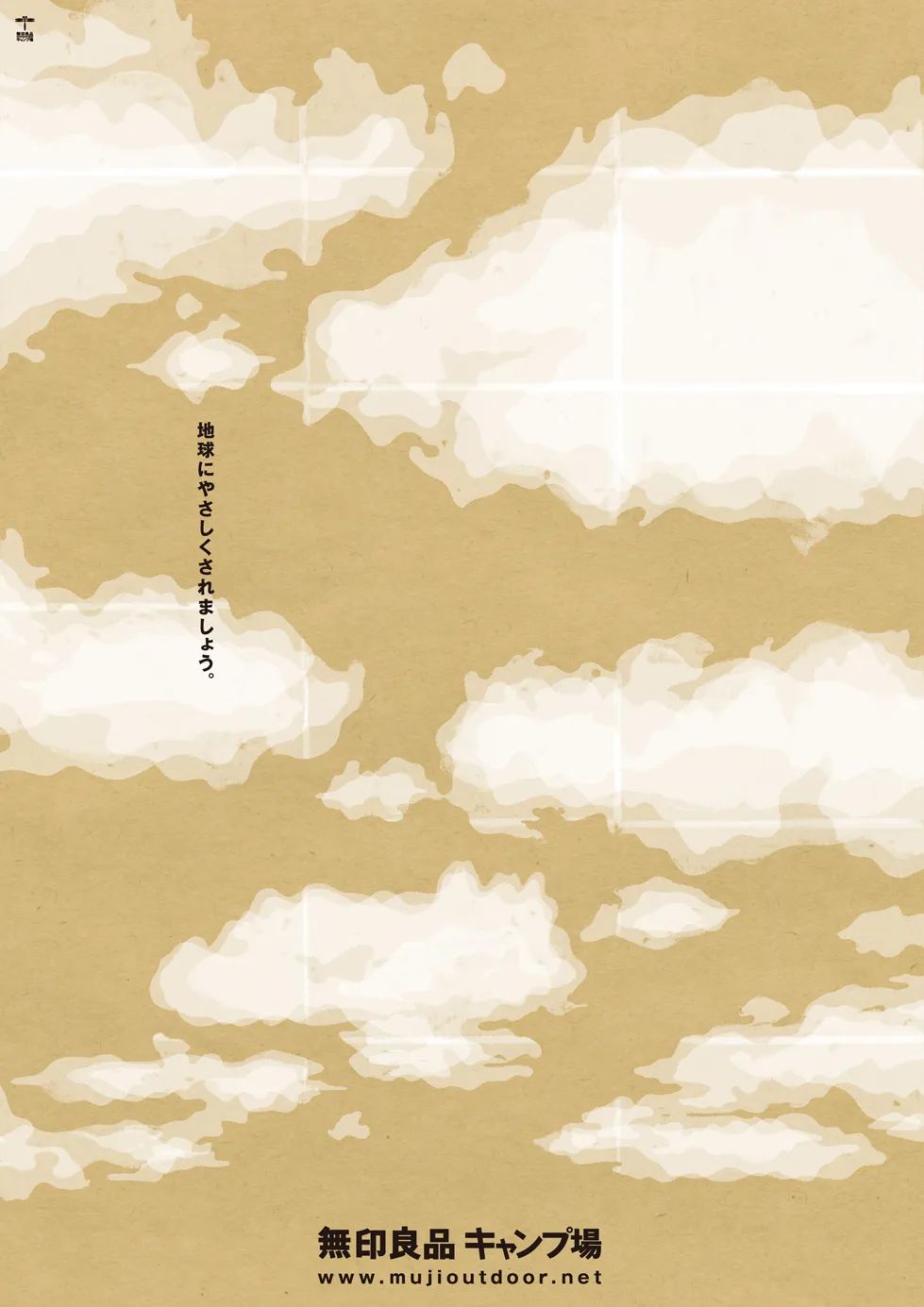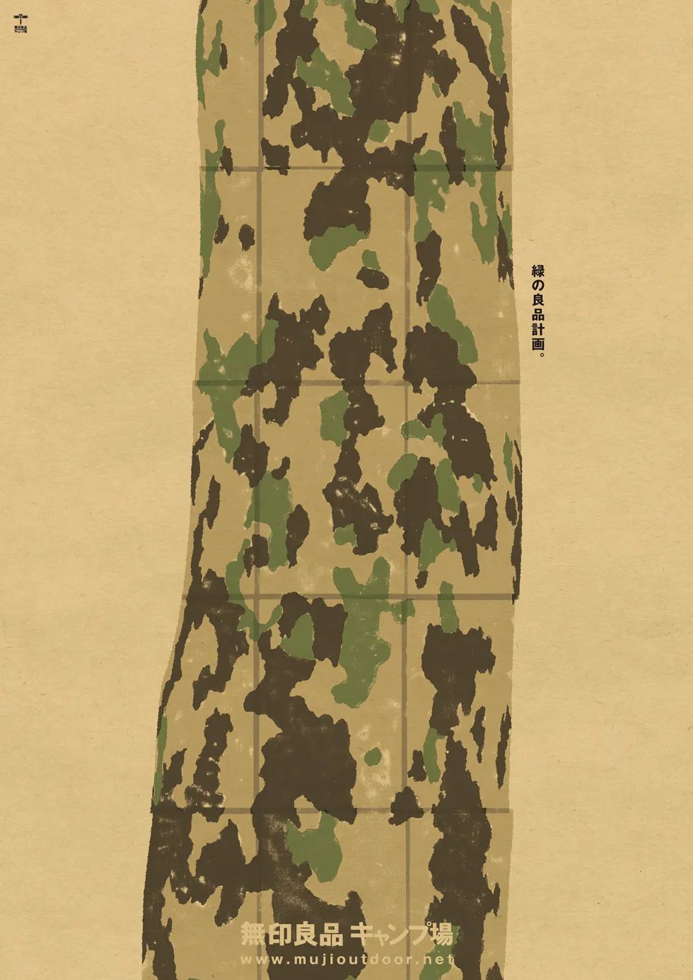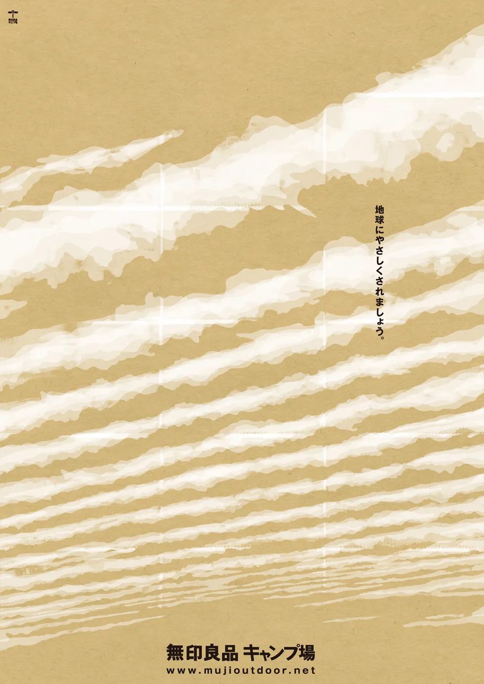 这组海报(2019)的主题是“人在自然中再生”,新村则人回收了一些被扔掉的纸箱,利用它们制作了帐篷和山,以此来表达循环利用的概念。