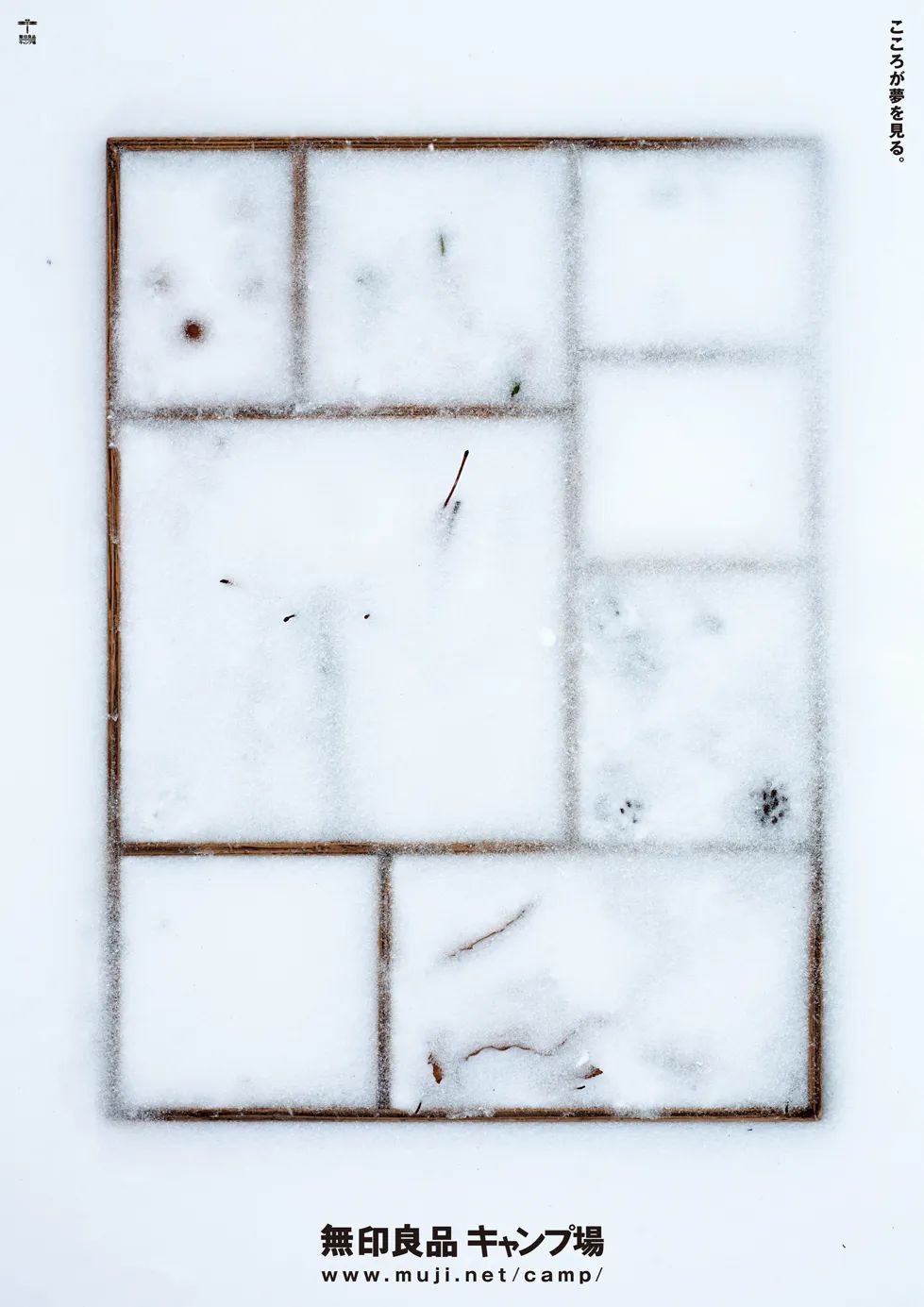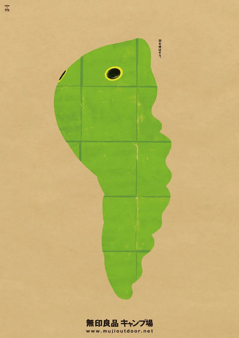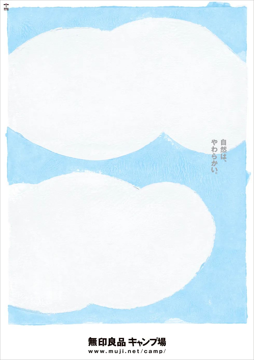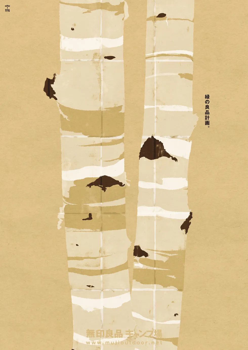 这组海报(2019)的主题是“人在自然中再生”,新村则人回收了一些被扔掉的纸箱,利用它们制作了帐篷和山,以此来表达循环利用的概念。