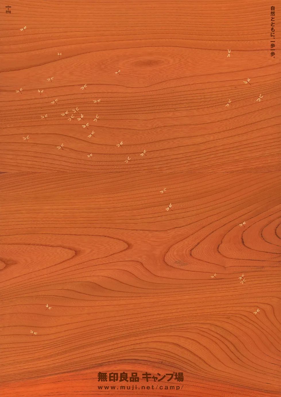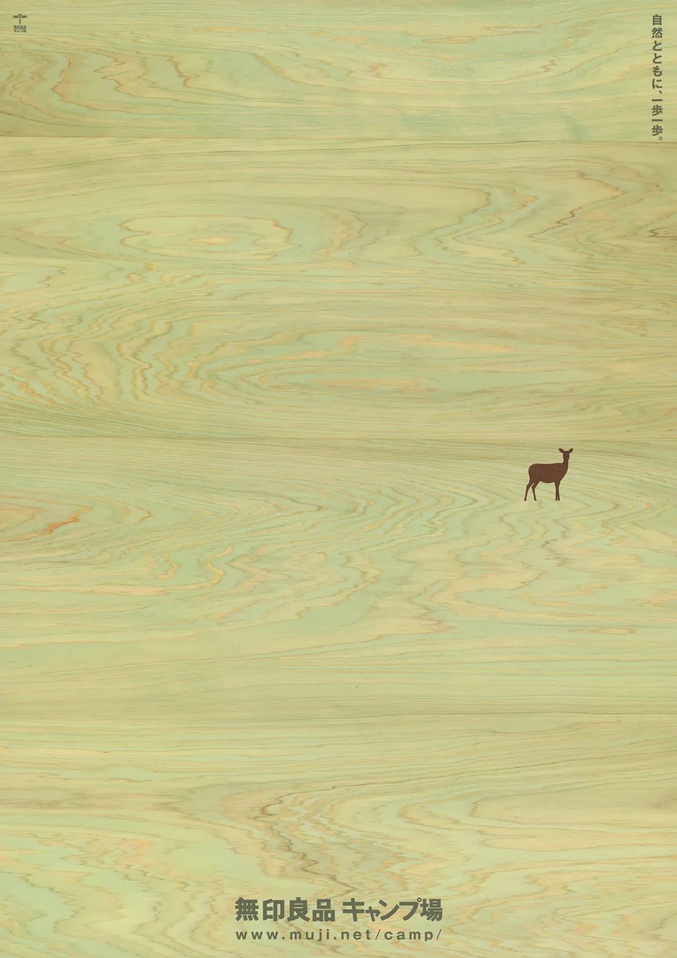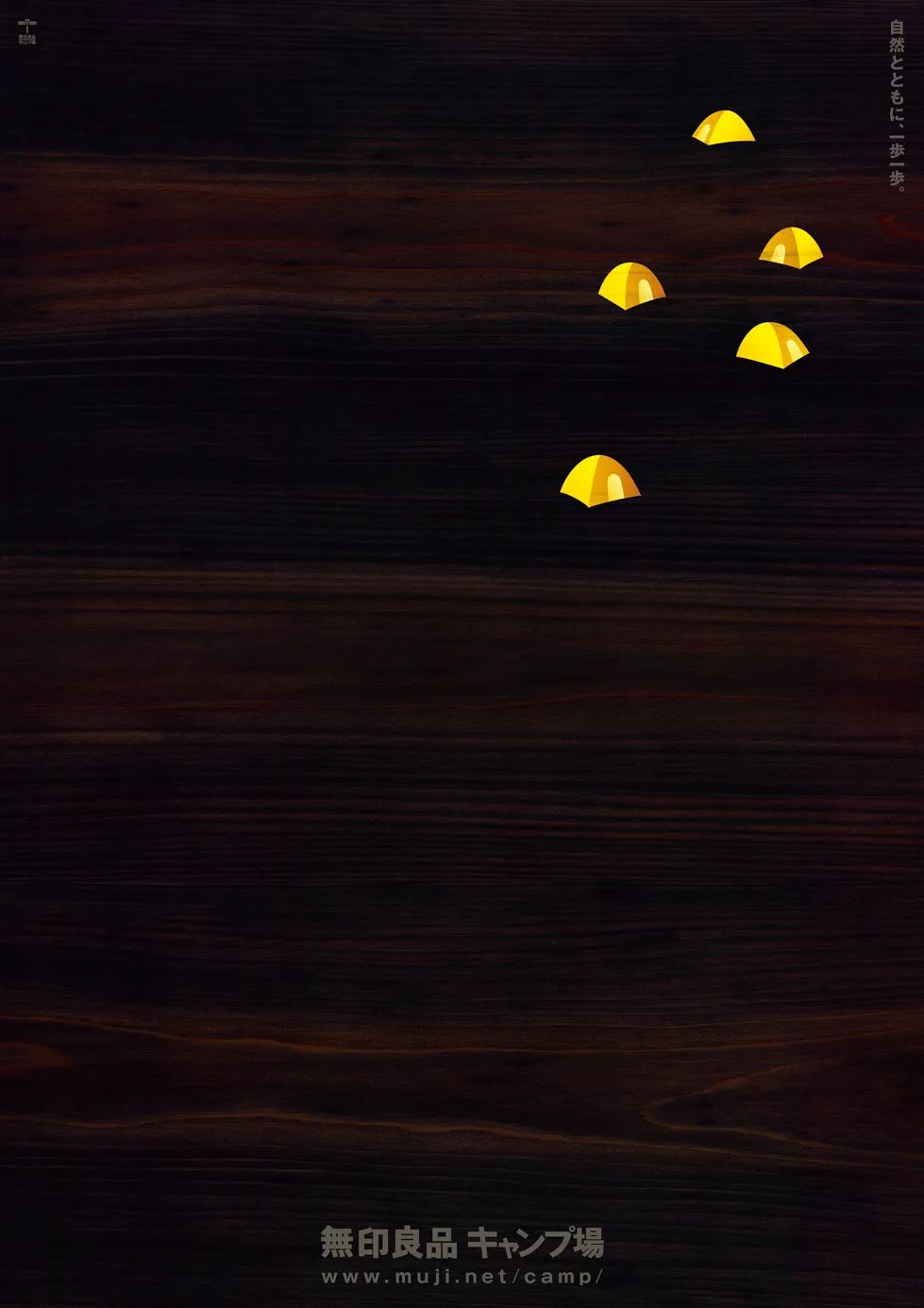 这组海报(2015)是想用木板的天然纹理来表现露营地的草原和湖泊。木板需要仔细挑选就不用多说了,染色更是颇费了一番功夫。依然有人建议新村用电脑给木板着色,但是他嫌效果太粗糙,决定自己动手染。尝试了几种方案均以失败告终,不是不够均匀就是不够透。灰心丧气之余他开始刷脸书,一不小心就勾搭上了“板染”技师清水将勇,当即决定杀去茨城县面基。最终,如愿以偿染出了满意的效果。建议放大观看。