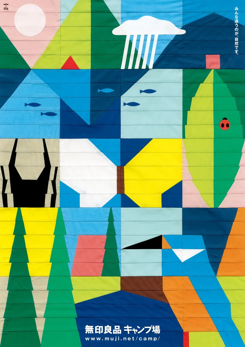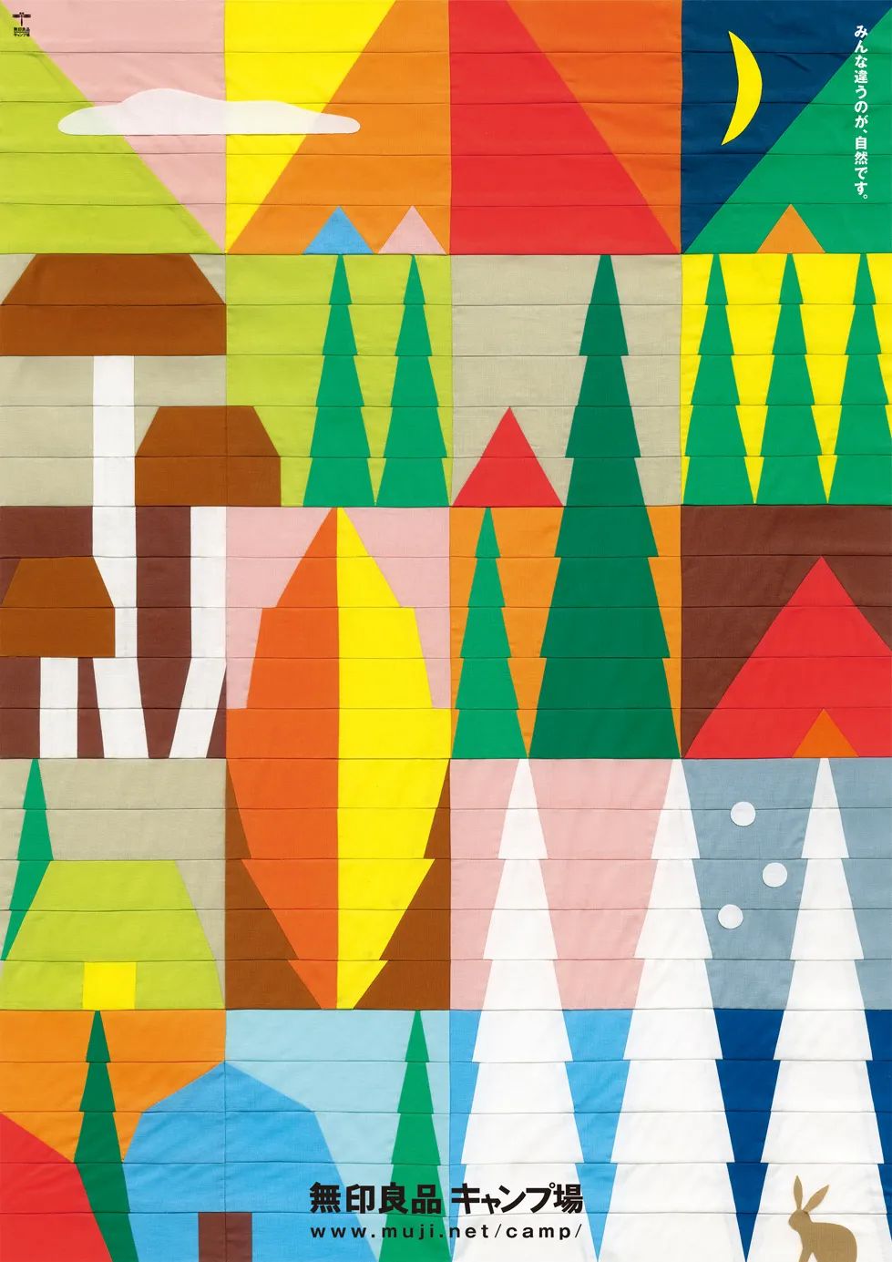 这组海报(2016)是通过三幅插画来展示露营地的各种场景,你放大仔细看,里面有很多美好的小细节,看得我都想就地露营。这三组插画由庭野広祐创作完成之后本来就可以了,但新村觉得还是缺少一些质感。这里我知道缺少什么质感,就是缺“手工感”,他的套路我已经摸透了。新村打算将这组插画做成露营被,于是他通过出版社找到了一本叫做《摩登被子风格》的作者藤田久美子和中岛一惠,请求她们来为他制作。写到这我觉得,在日本你干啥干得好就能成个“师”,我估计我姥姥要是生在日本,现在也能是个什么匠人。最终他们花了一个月时间缝出了这三床被,你可以再看看细节,缝得确实好。