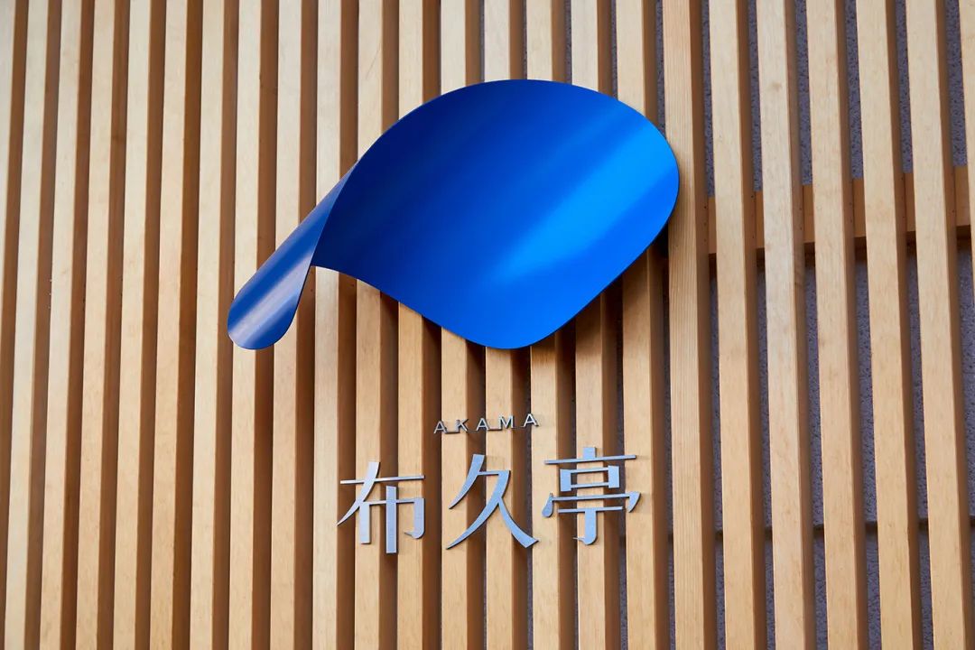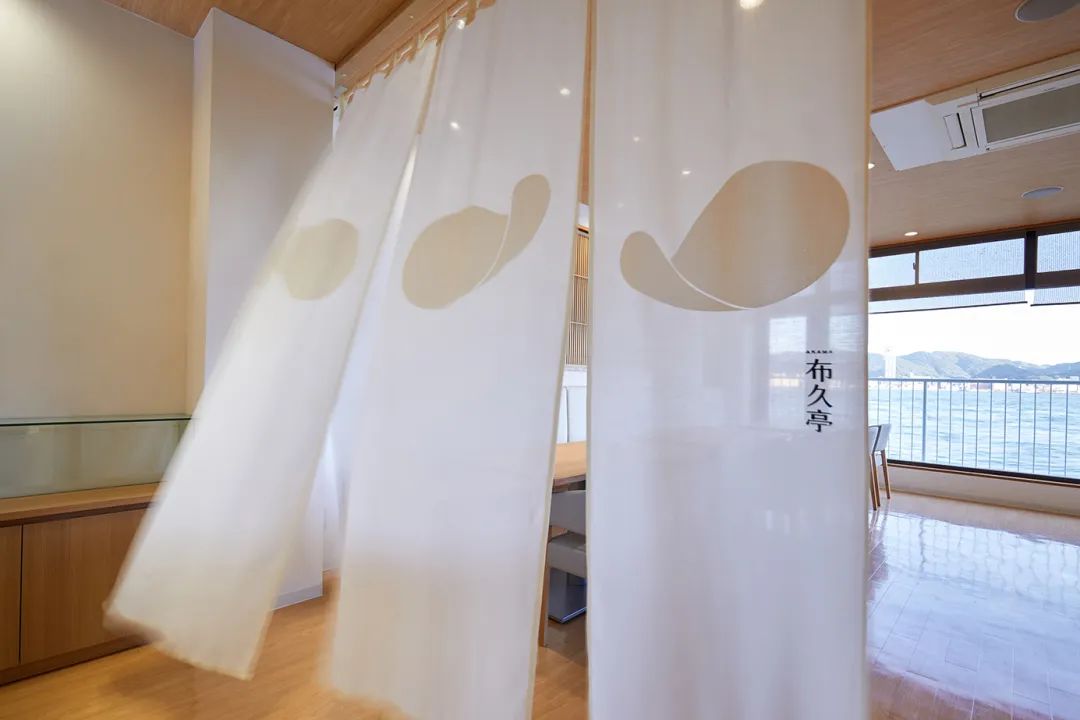 新村则人这个标志的灵感来自于被海峡的和风吹起的布帘,一进玄关,大布的门帘就被徐徐吹起迎接你,还未入座就能感受到惬意。