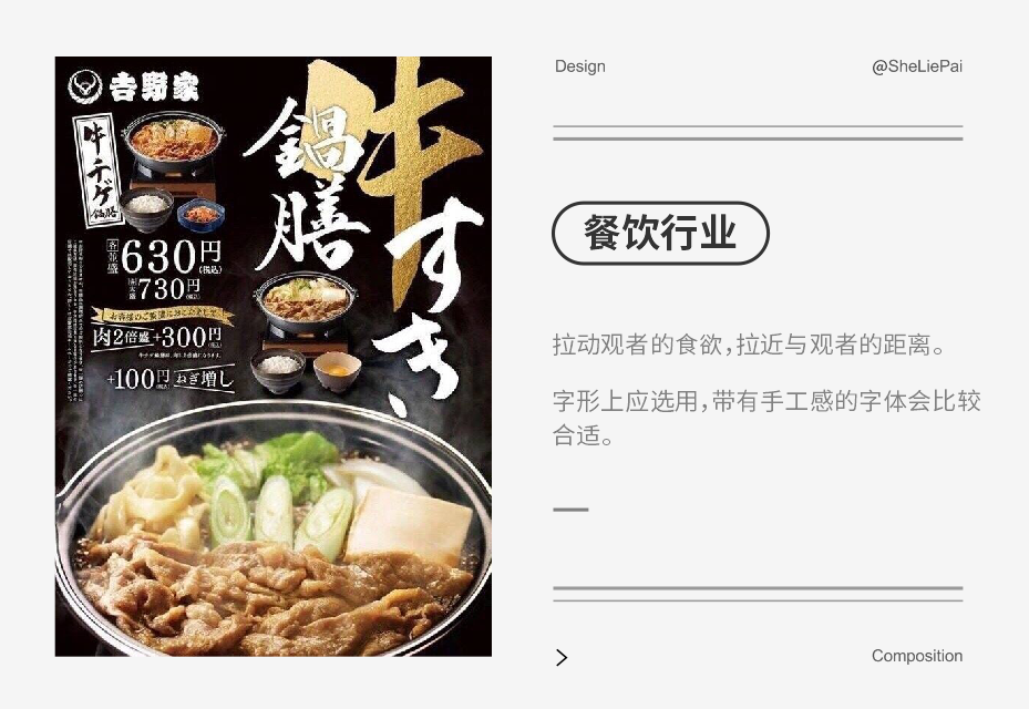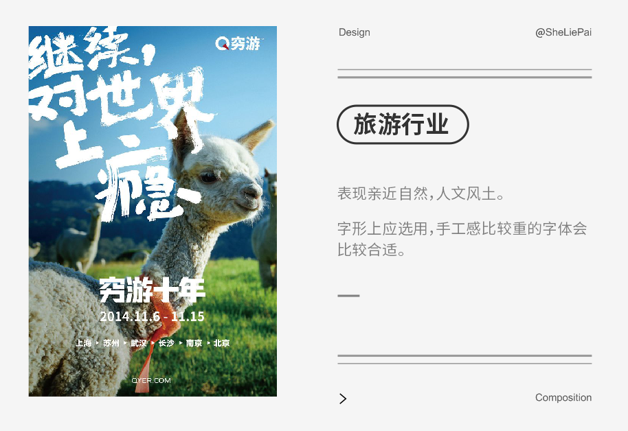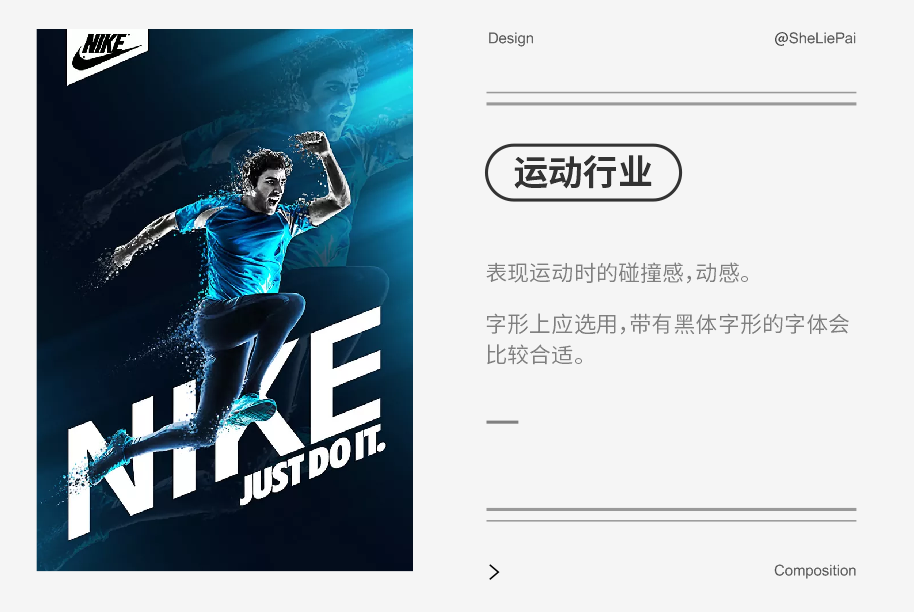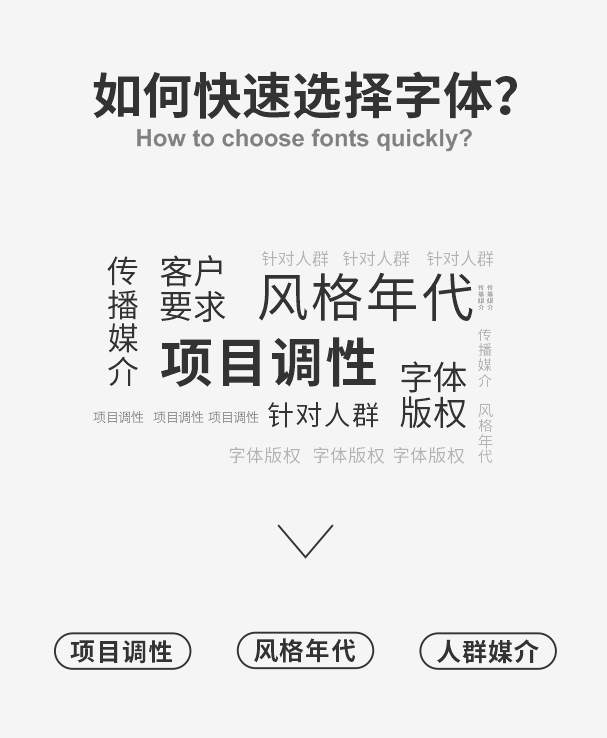 随着今天涌现出越来越多的优秀字体,设计师也开始有了甜蜜的负担,就是不知从何选起?看这个也好,看那个也好,但是搭配在画面里就怪怪的,所以今天就来说说如何快速选择字体。选择字体其实就是在找字形与项目的共通的部分,项目调性决定字体,同时字体也能强化项目调性。不符合调性的字体是非常不协调的,想象一下复古的产品搭配时尚的字体……下面我们通过项目调性的几大因素,来分析合适的字体。 不同的行业,选用的字体也不一样,这里给大家找几个比较有代表性。了解了字体的选择规律,下面通过两个小案例,更直观地感受一个字体对于画面的影响。怎么样,是不是选字有点感觉了,平时记得要多练习,列关键词,画联想图,你就能更好地用字体表达画面。