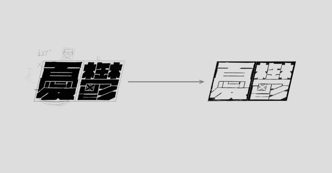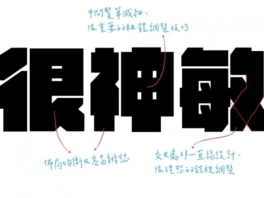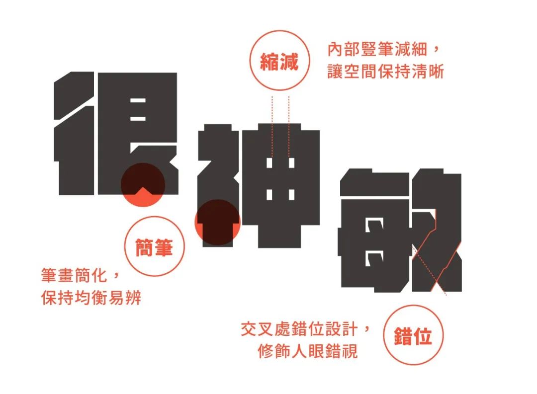 一般字型设计都是由字体骨干「黑色」的部分著手、并决定每个笔画该长什麽样,激燃体则相反,先将白色的负空间造型设计出来,以空间配置为重。