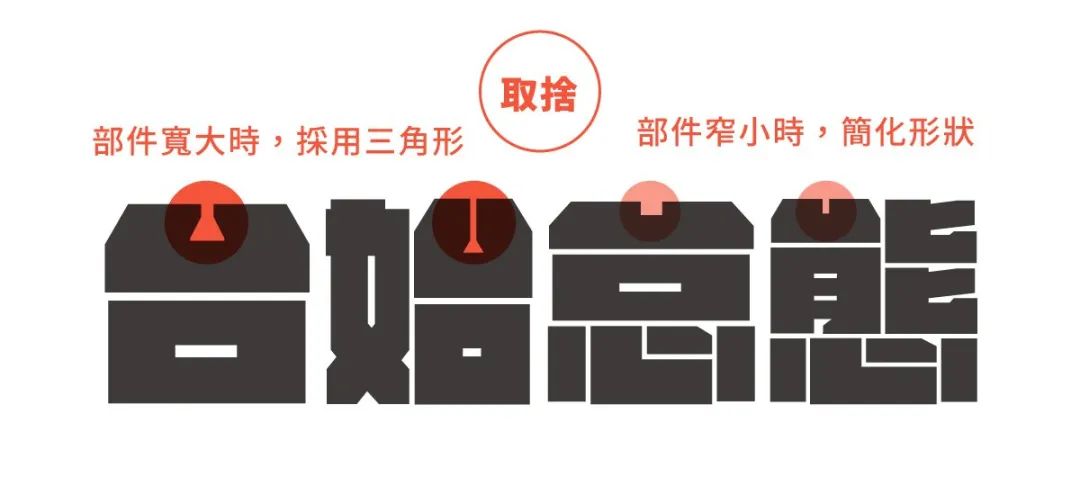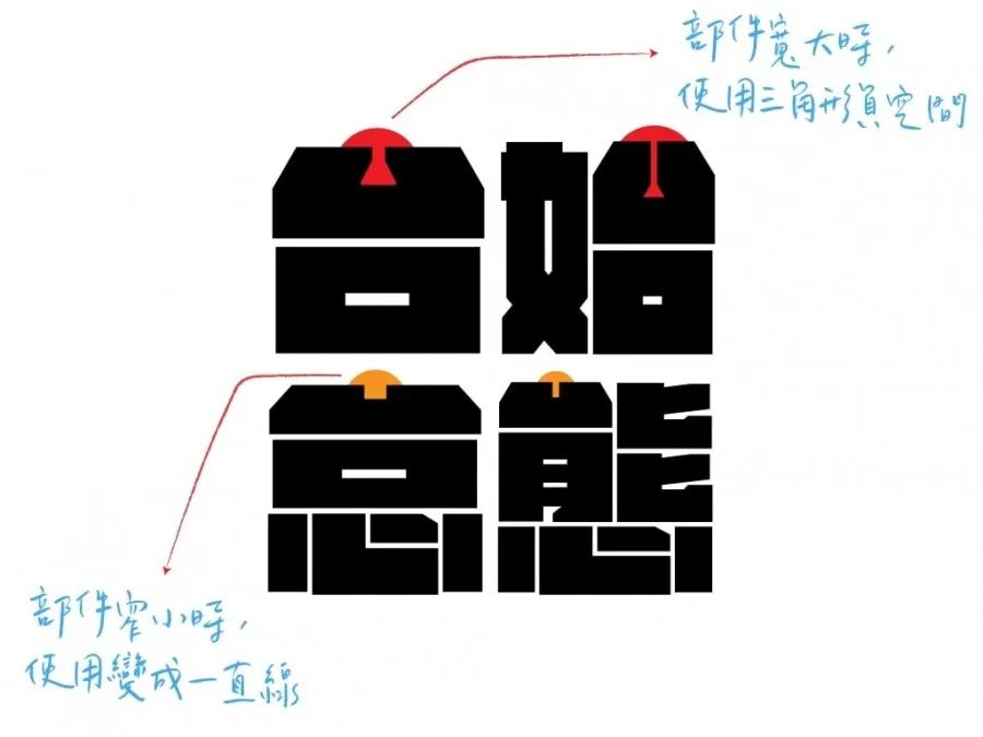 另外,因为笔画粗所以白色空隙处变得小而零碎,容易感觉凌乱,成了林芳平花许多时间克服的的大问题。即使找到一个解方,同一个部件在其他字中以不同大小出现时,便考验著设计师的功力。例如下图示范的「ム」,在「台」字上将空间以三角形安排,但换到「始」、「怠」、「态」等字当中,就必须以一直线处理。