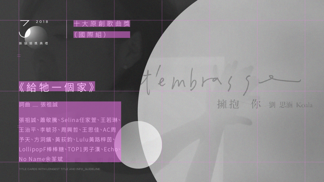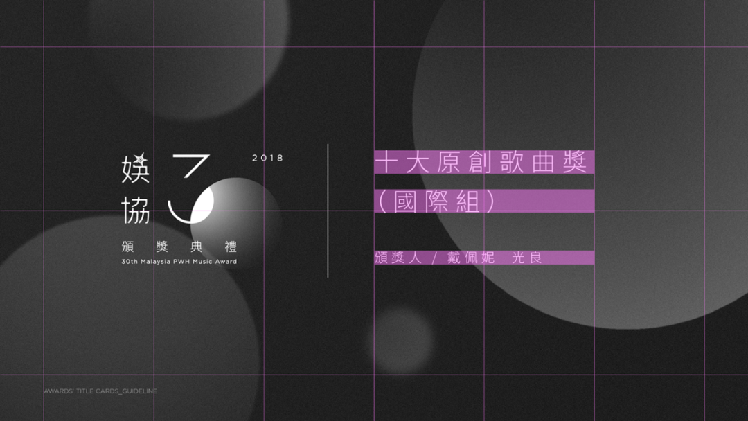设计作品曾获选刊登于著名设计网站 Fubiz.net、Designtaxi.com、Designspiration.net、Betype.co、香港viction:ary出版的《Hanzi • Kanji • Hanja》设计书籍、马来西亚的《CUTOUT》设计杂志、CTA⋯⋯设计师 KF Lim 利用色彩与滤镜特效的手法表现光芒、光晕,希望以光去荣耀音乐工作者,不管是舞台上的聚光灯或是对作品的坚持而看过无数清晨的曙光,都是对他们在音乐路上付出与贡献给予肯定!纯属自发性创作,图片撷取自MV画面与娱协FB粉丝页,部分内容纯属虚构、仅作为模拟示意之用途。image source / latest news:www.facebook.com/pwh.music/Awards / presenter title card _ guideline入围/获奖 _ 字卡设计( 奖项名称 最短 1 行 与 最长 2 行 )Nominee / winner title card _ guidelineClé de Peau Beauté肌肤之钥15週年品牌形象影片该影片,藉由品牌VIP顾客和资深员工的访谈,象徵品牌的钥匙打开代表人生不同面向的「门」作为譬喻,和你、我相互陪伴的我「们」双关语意,和开啓女性内在光耀能量与信念的那把金色钥匙所相互交织出的三组动人故事。Production:Film Power Shanghai | Director: 陈宏斌 | Assistant Director: 詹凯 | Executive Producer: 曾啓福 | DOP: 夏邵虞 | Cameraman: 陈柏任 / 詹凯 | Art Director: 陈柏任 | Producer: 顾宁 | Stylist : Dora | Music: A-len Yue 余佳伦 (MUSDM.com)《居銮在动》音乐节的主办单位与活动地点是一间提供乐器贩售、音乐教学的複合式艺文咖啡厅。店里主要贩售的乐器有ukelele,因此以ukelele的造型为设计概念,利用异材质(橡皮筋)去表现琴弦,增添互动性与趣味性。印刷技术部分找了马来西亚有名的凸版印刷工作室 The Alphabet Press (TAP) 合作,选择以强调质感与触感的凸版印刷技术,提升门票的精緻度与收藏价值。handmade postcard-好马不吃回头草W I S D O M Handmade Typography project更多作品 be.net/limkfung