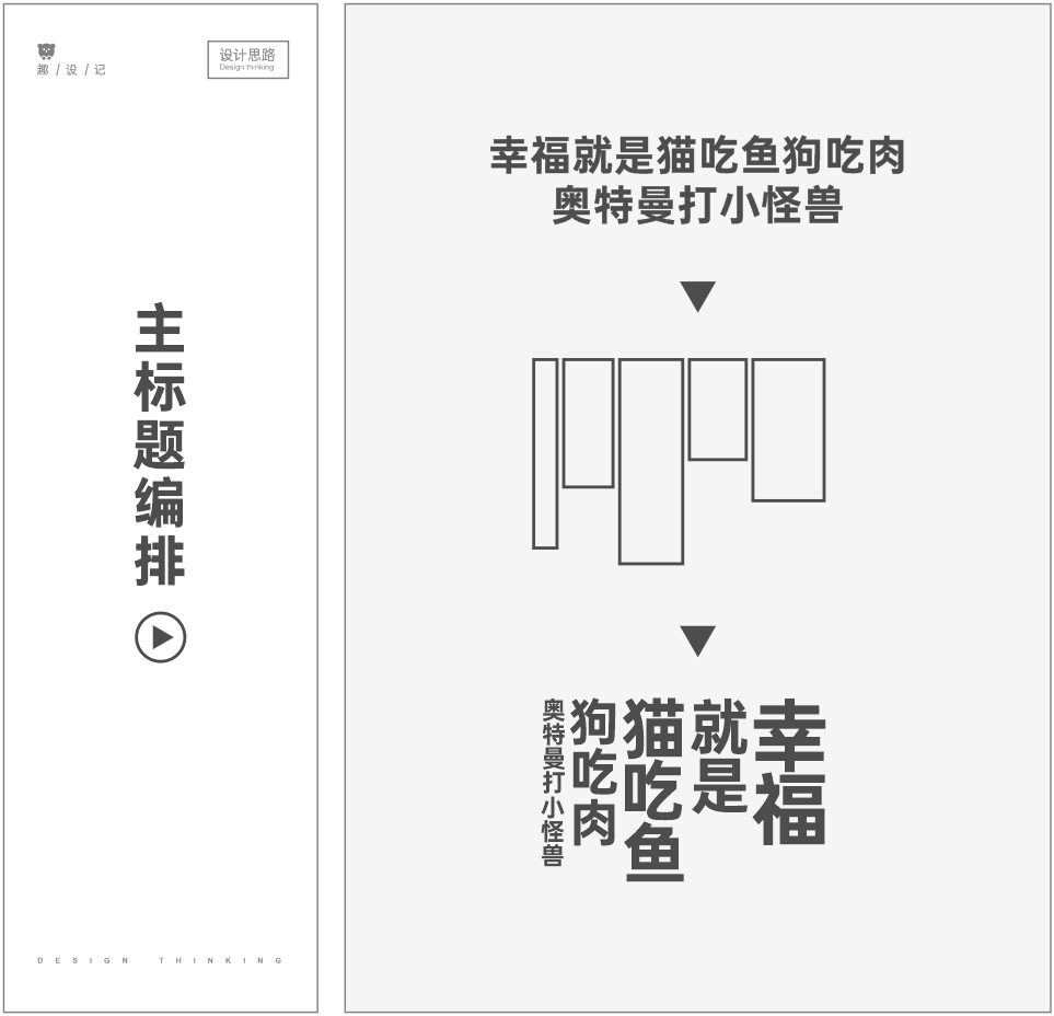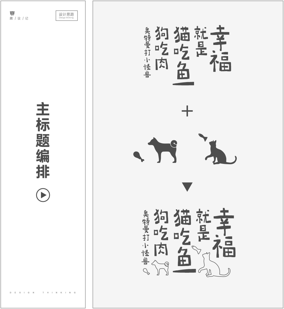 接下来我们改变字体,选择一个手写感比较强的字形(这里用到的是字魂127号-月岩体,不可免费商用),然后对大小进一步调整,找来小猫和小狗的插画剪影进行搭配,这样主标题也变得有玩味性了。
