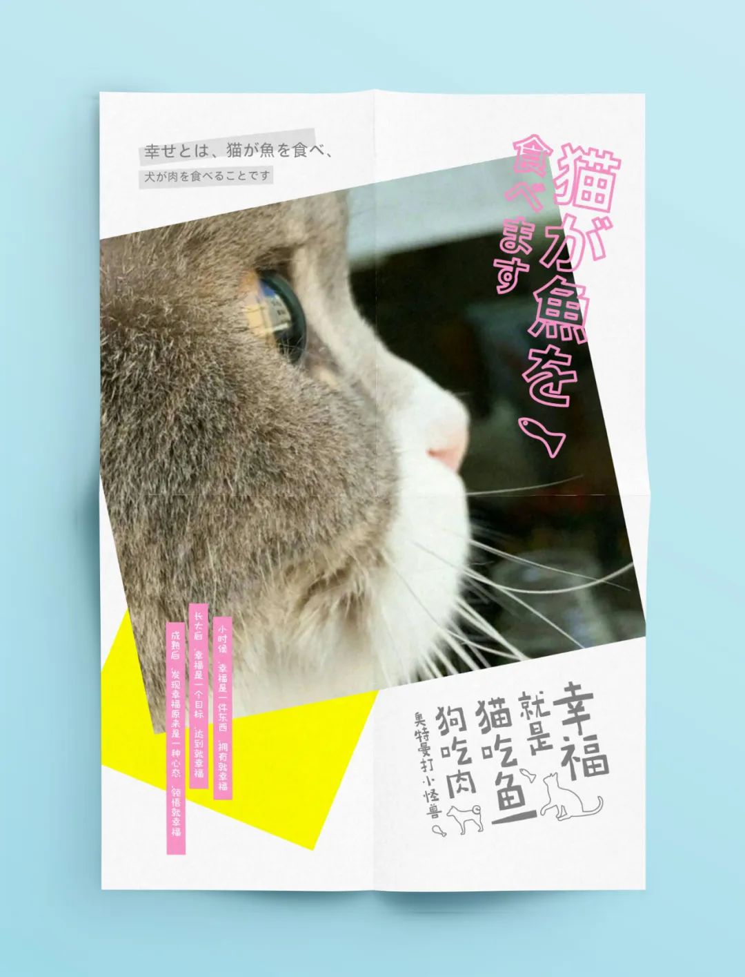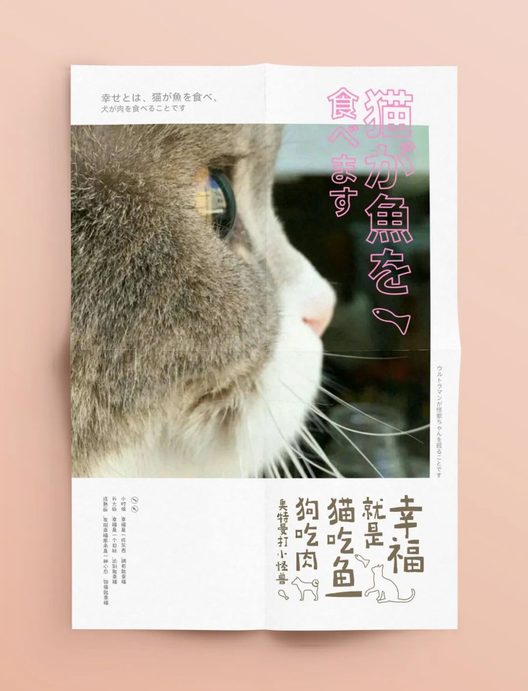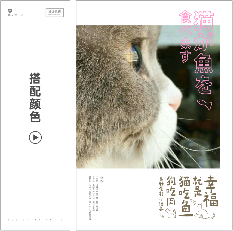 我们接着搭配色彩,字体颜色改成猫猫的毛色,日文“猫吃鱼”变成粉色作为点缀色。