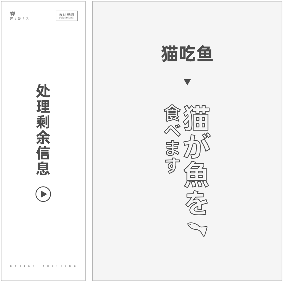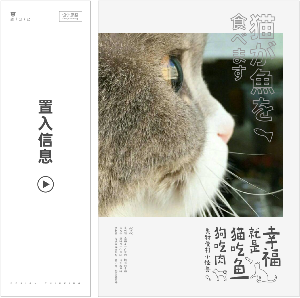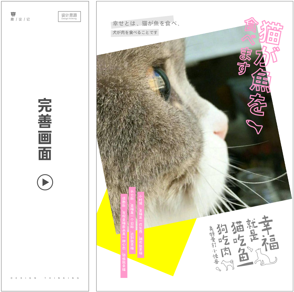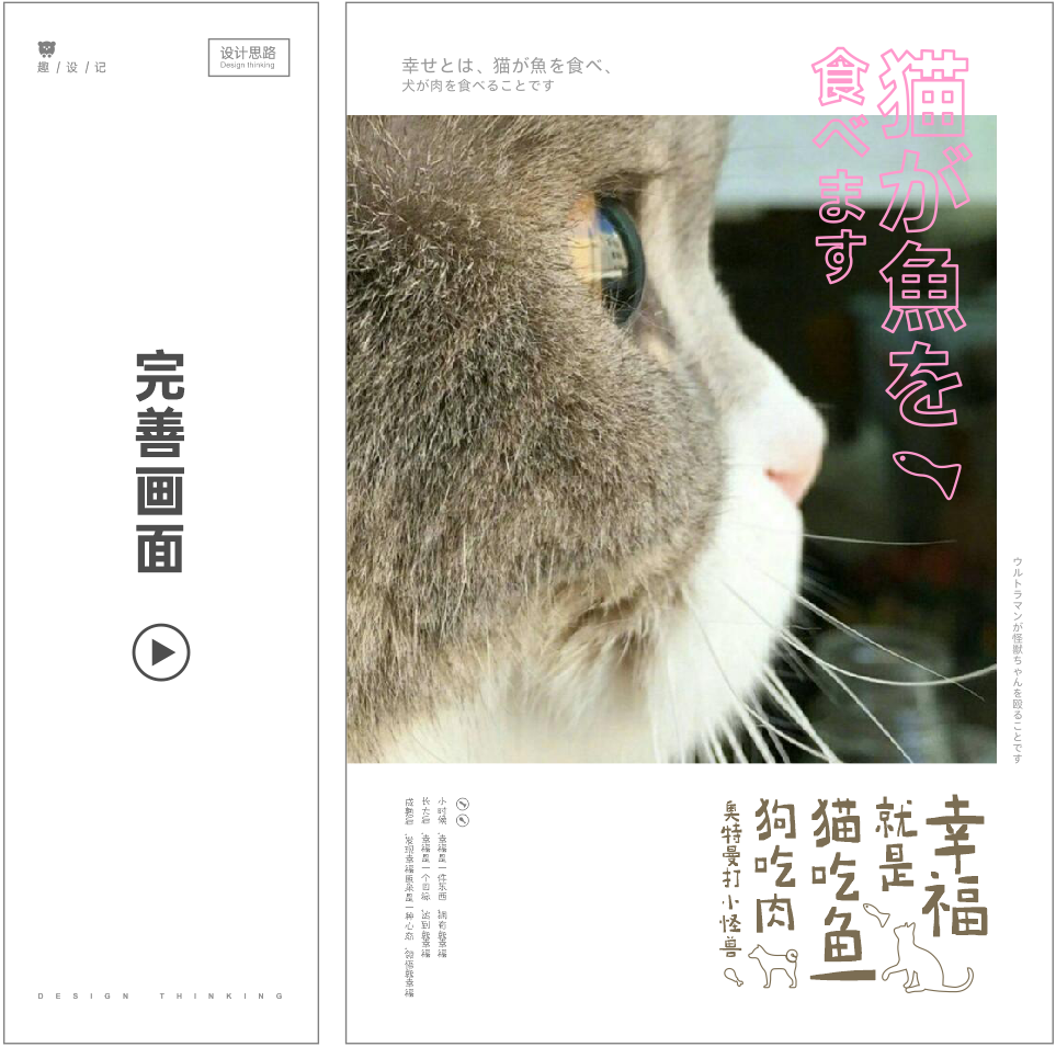 我们接着搭配色彩,字体颜色改成猫猫的毛色,日文“猫吃鱼”变成粉色作为点缀色。