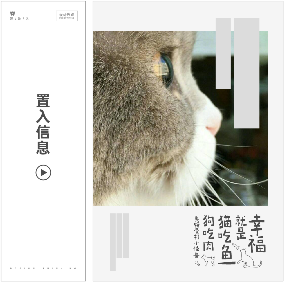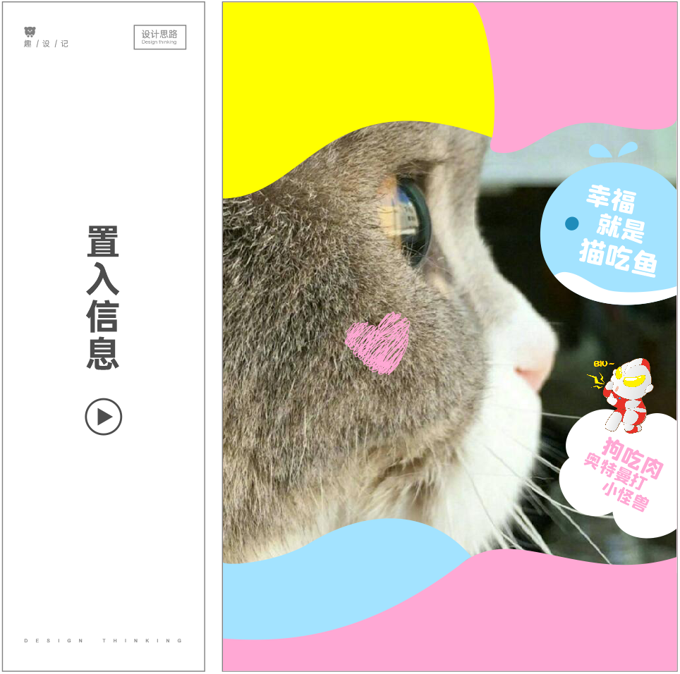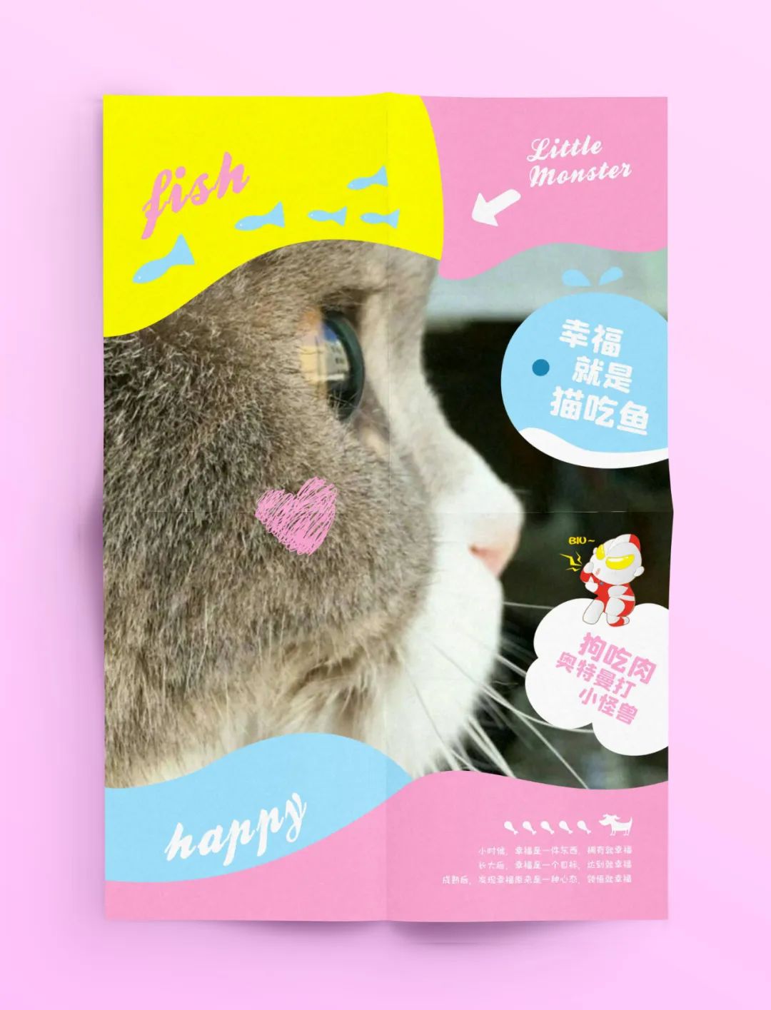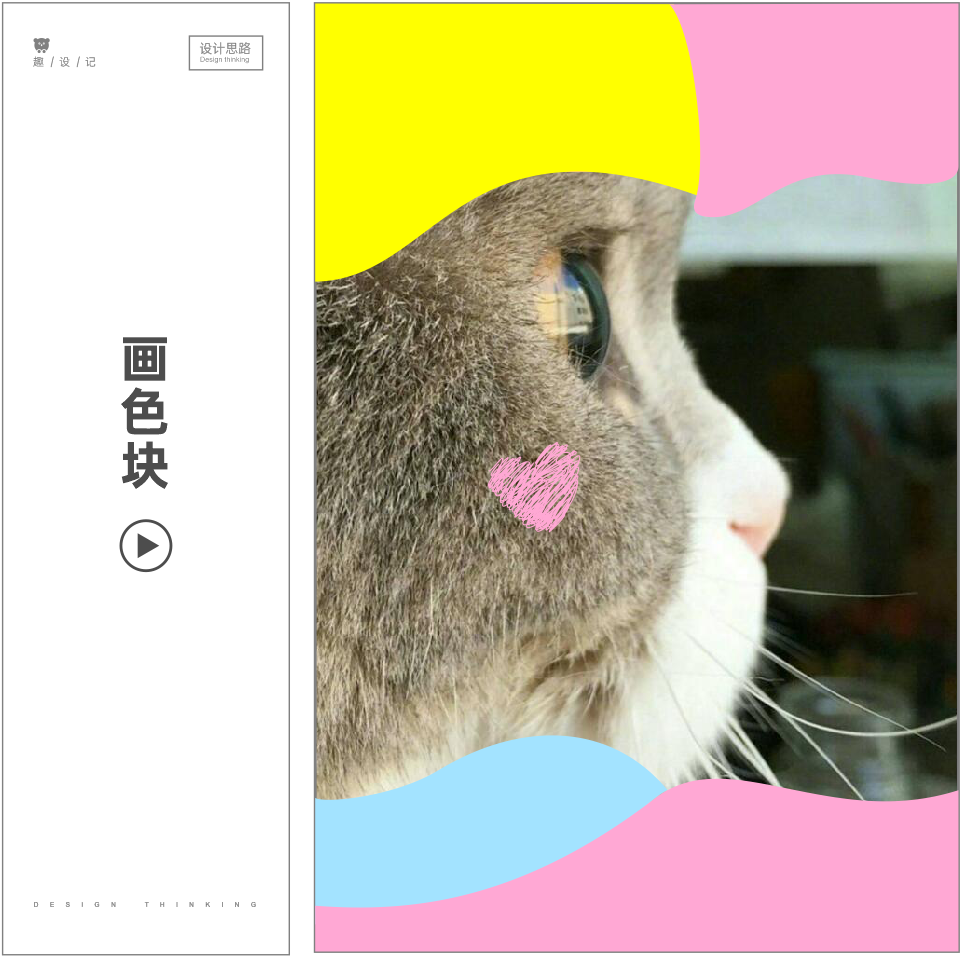 ,这幅偏手绘,画面配色也是比较跳跃,我们知道这张猫猫照片,上下被截断了,那么用色块给它填补上,色块分割空间之后用来承载信息,给猫咪脸上画个小心心。