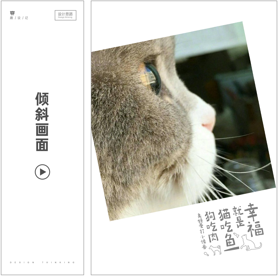 What?觉得画面比较规整,那我们在这个基础上变成比较活泼的画面,please擦亮眼睛。最简单的方式,画面进行倾斜,这样整个海报感觉就不一样了。
