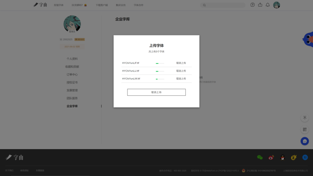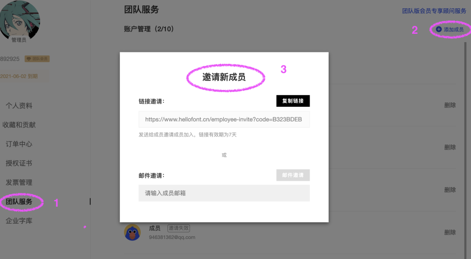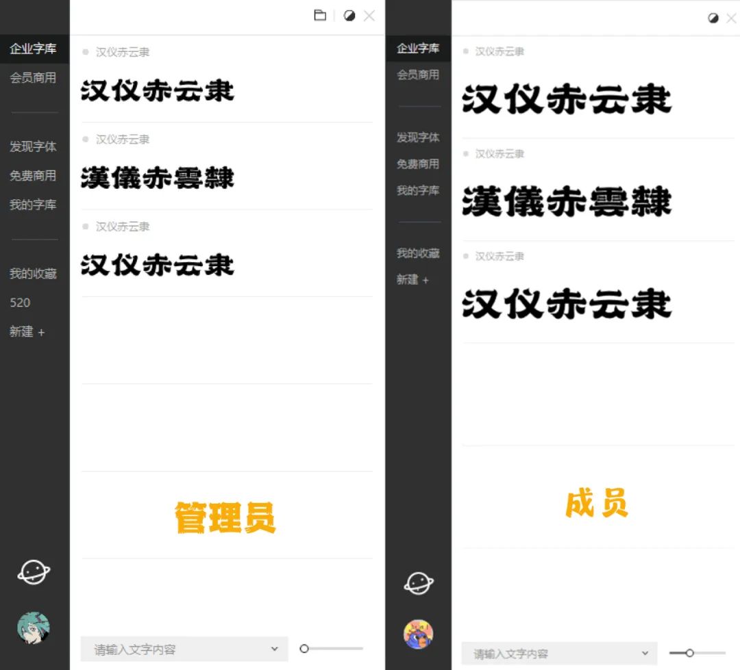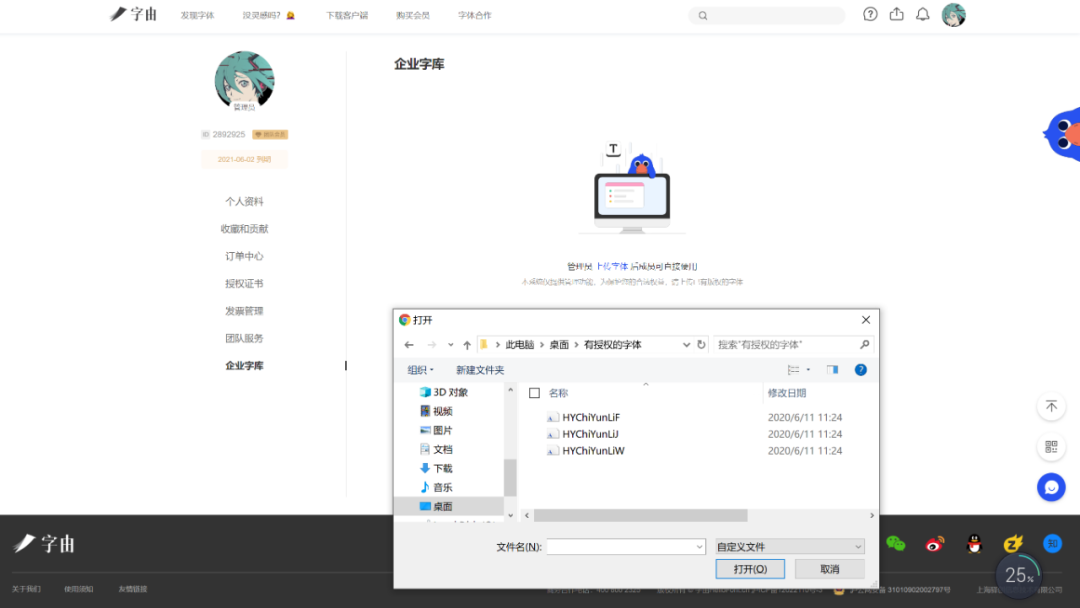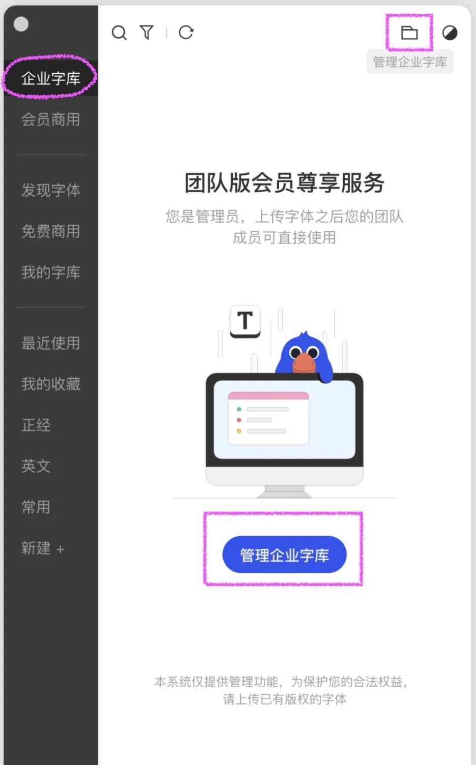 不过它俩也有不同点,首先你必须是团队版会员(个人版会员没有这个功能),其次成为管理员(下单购买的那个账号),才可以上传、管理字体,最后是会跳转到官网操作,不可以客户端直接上传。