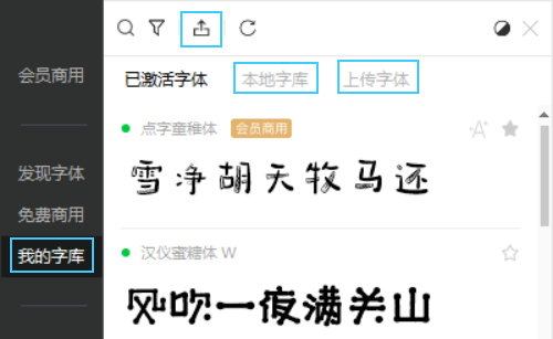 我的字库知道吧,是方便你个人管理的,包括已激活字体、本地字体,还有上传字体。