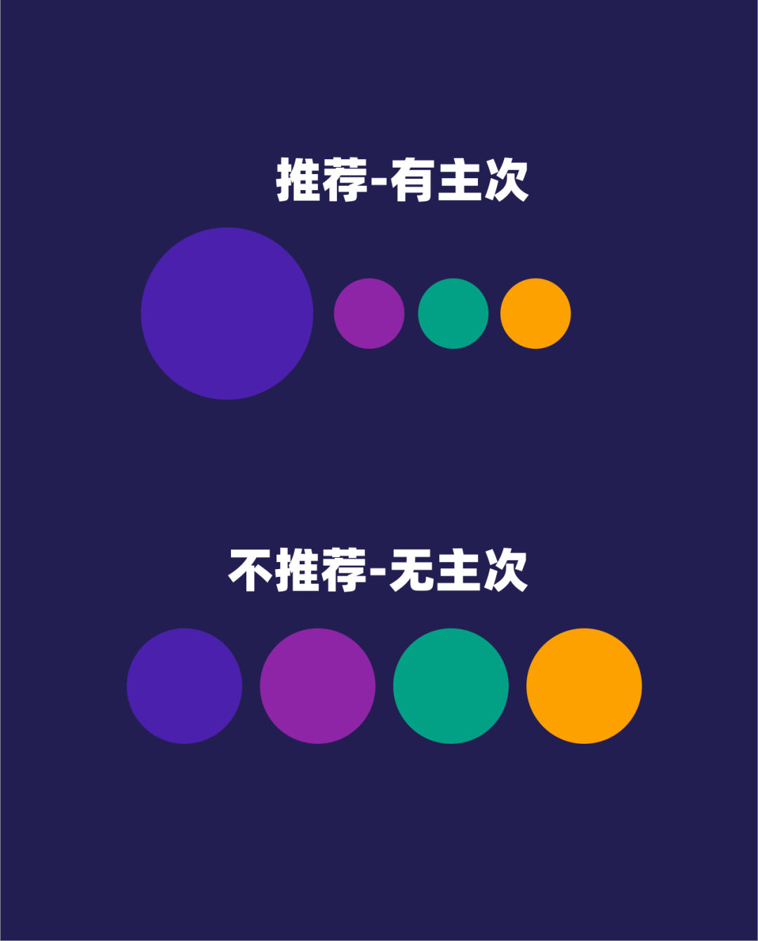 对于新人来说,最开始的时候,最好只使用一个主色,其他全是辅助色,如果你的颜色没有主次,就很容易用乱:
