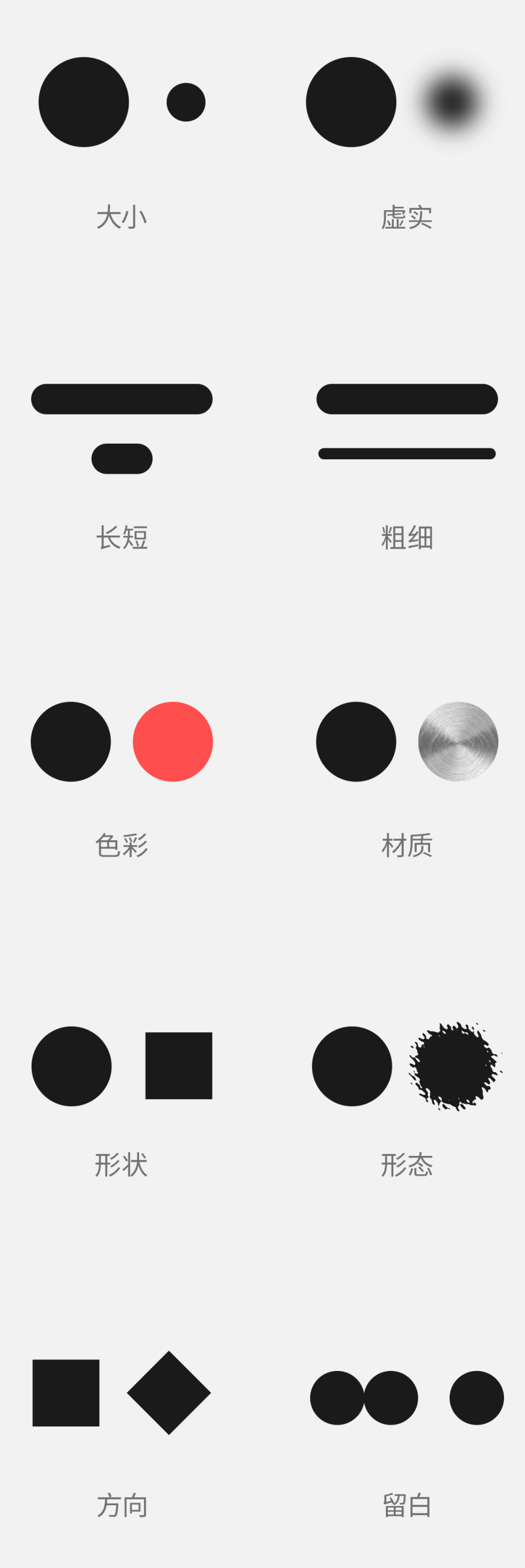 所以在工作中,我们无需刻意强调哪种对比形式对应哪种作用,因为很多都是互通的,根据自己的设计目的,做到灵活使用即可。