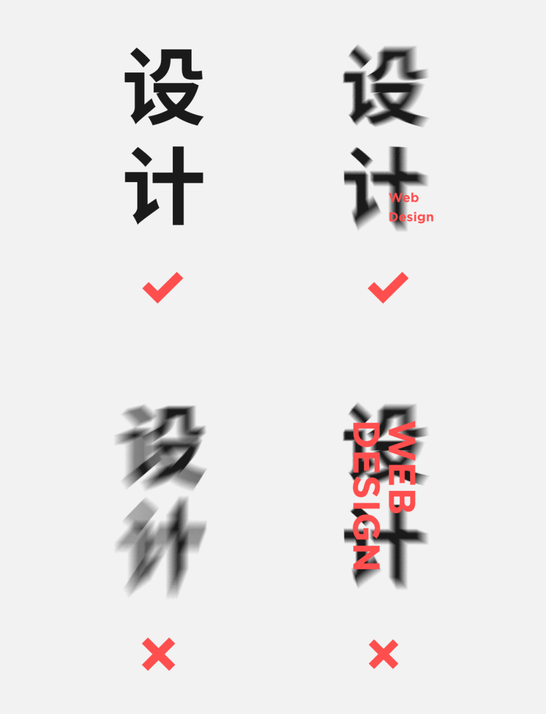 但也要强调:作品并不是越跳跃就越好,比如一些作品本身就是想营造一种安静、统一的感觉。而像儿童节海报,整体感觉活跃一些会更好。所以一定要结合最终目的进行设计。首先我们先来说下:设计感对于作品来说有用吗?比如我们常说的点缀性的元素、英文、线条等等,其元素本身在作品中并没有太大的含义,只是起到辅助、点缀的作用。所以你可能会听到甲方或者老板问你:为什么要加英文,谁能看懂?除了填充空白的作用,还有个目的就是提升作品的设计感。举个现实中的例子:同时有两女生站在男生面前,一位普普通通,另一位肤白貌美大长腿,你会看谁多一眼?但需要注意的是:不要一味的强调设计感而忽略了目的性,设计感也许可以让你原本70分的作品向90分提升,但肯定不会将50分作品提升到70分,因为你最基本的都没做好,谈设计感就是本末倒置了。同样都是以设计二字为主体,下面两个案例就属于过分强调设计感而忽略了目的性,关键文字的识别性高于一切设计感。而上侧两个案例,相比而言,右侧在兼顾文字识别性的前提下,给人的感觉更新颖、富有层次感和设计感。