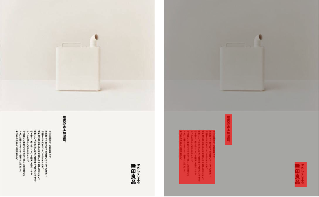无印良品的产品画册设计中,可以看到大量的这种非对称式的文案排版方式。