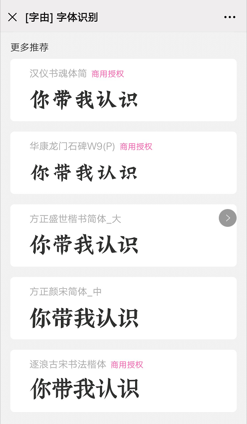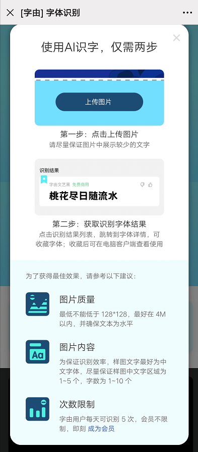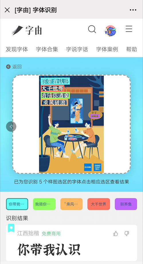 真的是“字体盲人”的福音,再也不用为看到一款好看的字体,却不知其芳名而发愁了,最重要的是字由会员可以无限享用,字由用户每天也有5次机会。
