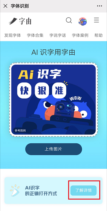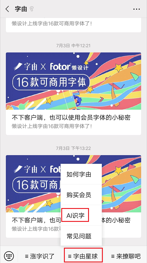 是不是超方便?还有更方便的,手机一键识别,点击字由服务号的菜单栏,在字由星球中找到AI识字。