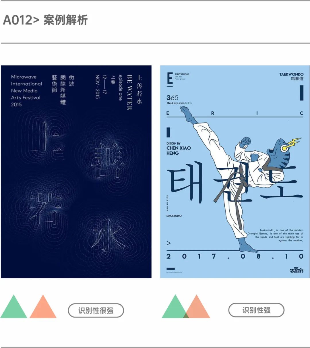 正确的方式是这个,左边的海报以深蓝色作为背景,文字信息上并没有与其他图片或者图形产生位置上的叠压,所以识别性很强。右边的海报同样也是纯净的背景,只有大的主标题与人物进行了叠压,所以在识别性上影响很小。