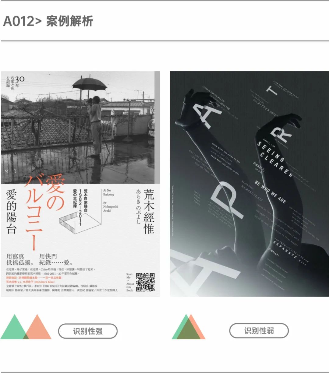 再看一个,左边的海报属于偏文艺的画面,主体是画面中的主图,平稳安定,主标题与主图进行了很小面积的位置叠压,识别性相对较强。而右边的海报主体是人物,信息与人的手臂进行路径上的穿插叠压,形式感十足,但是识别性比较弱。