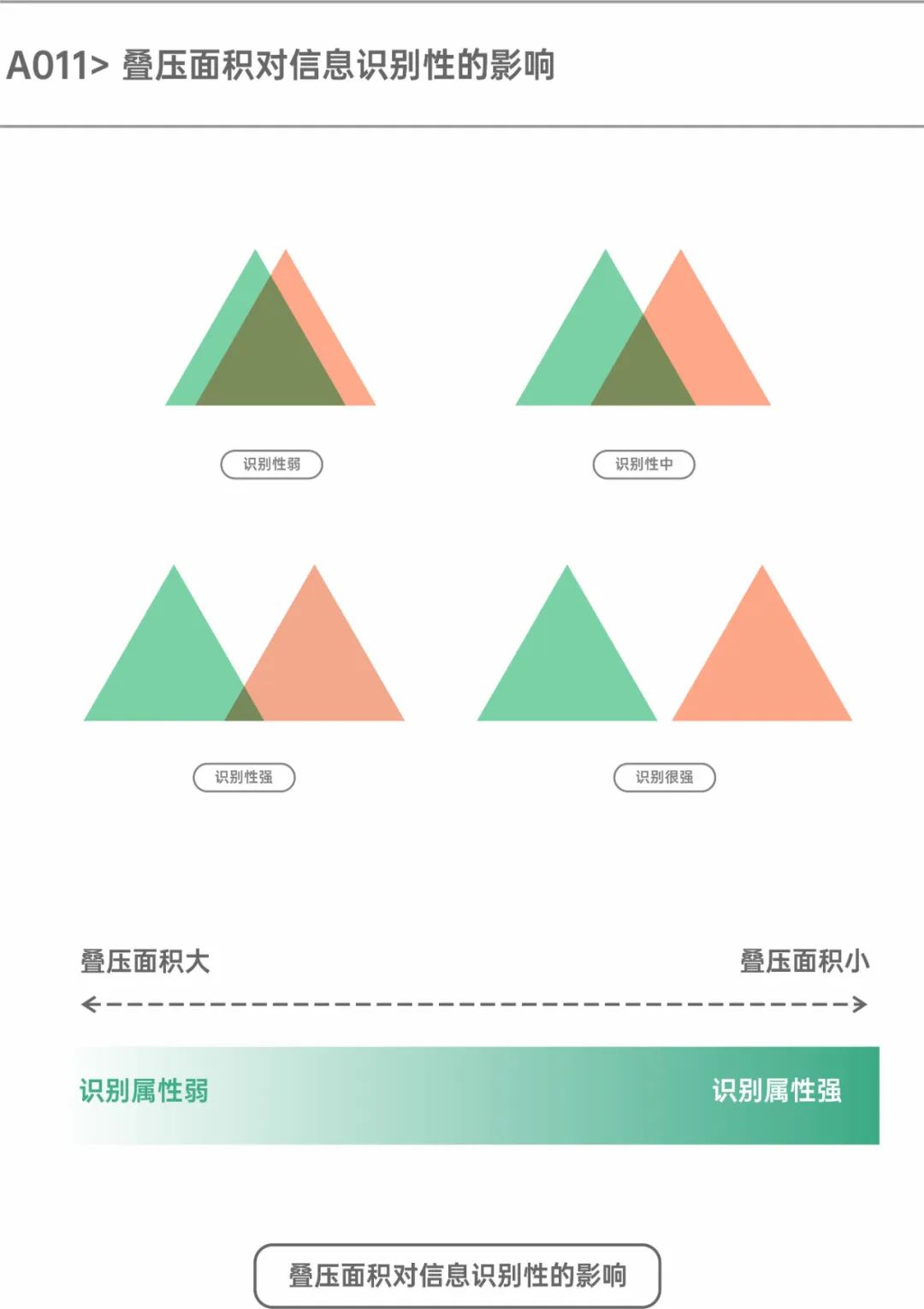根据叠压面积的大小,会影响信息的识别性,即相互之间叠压的面积越大,文字信息的识别属性就越弱,相反识别属性就越强。
